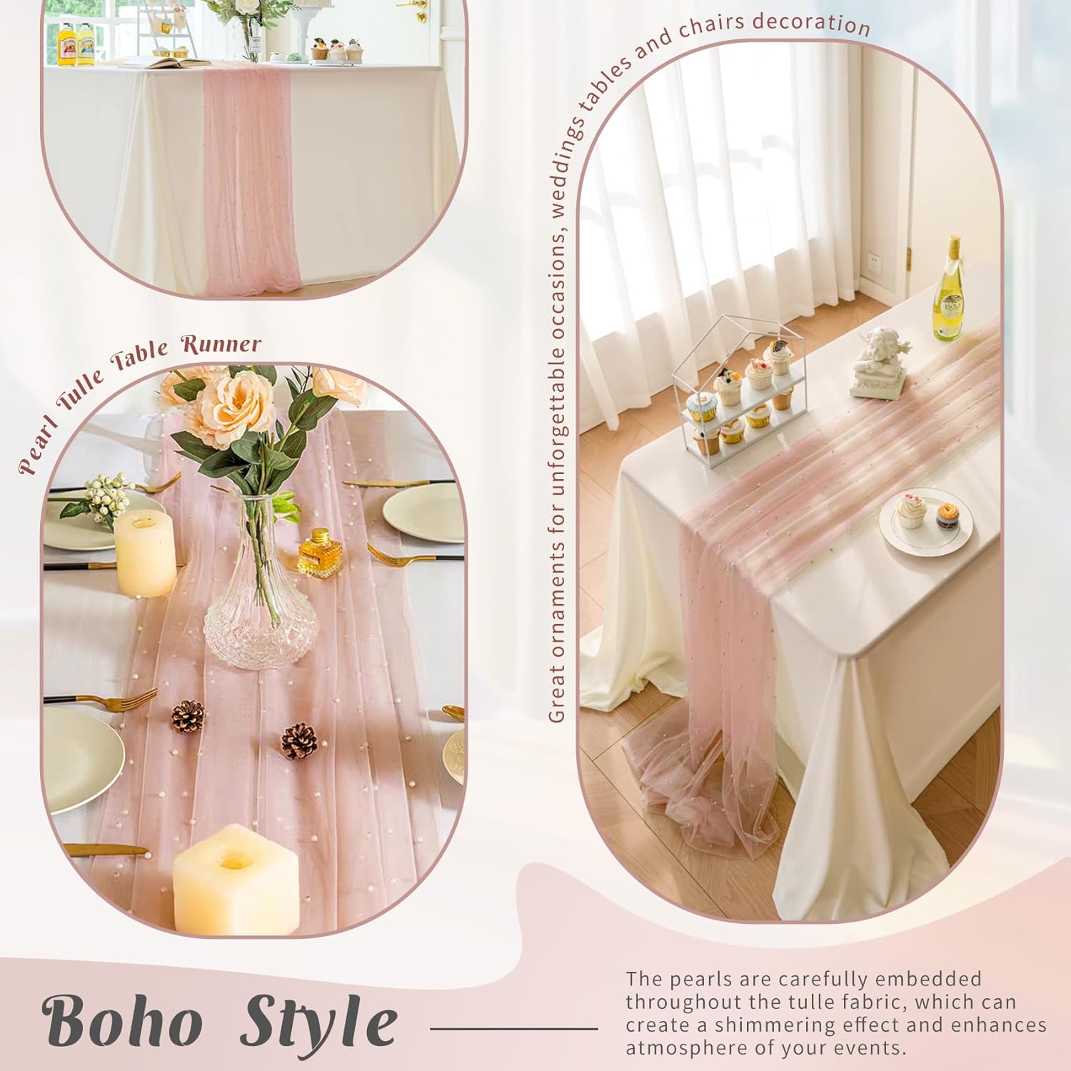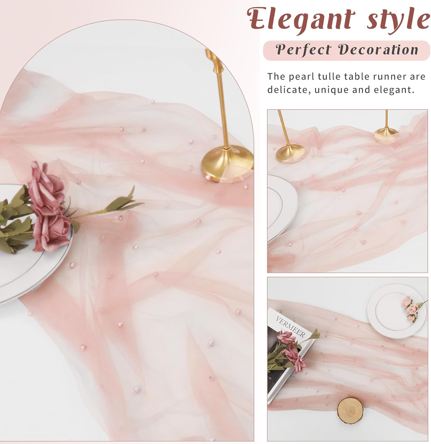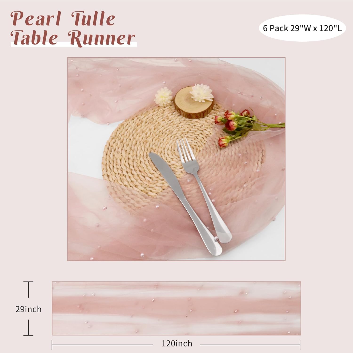 Set of 6 Pearl Table Runner 29 x 120 Inch Dusty Pink Tulle Fabric Lace Table Runners Boho Rustic Table Runners for Bridal Shower Birthday Party Wedding Arch Aisle Veil Dessert Table Decor(Dusty Pink)