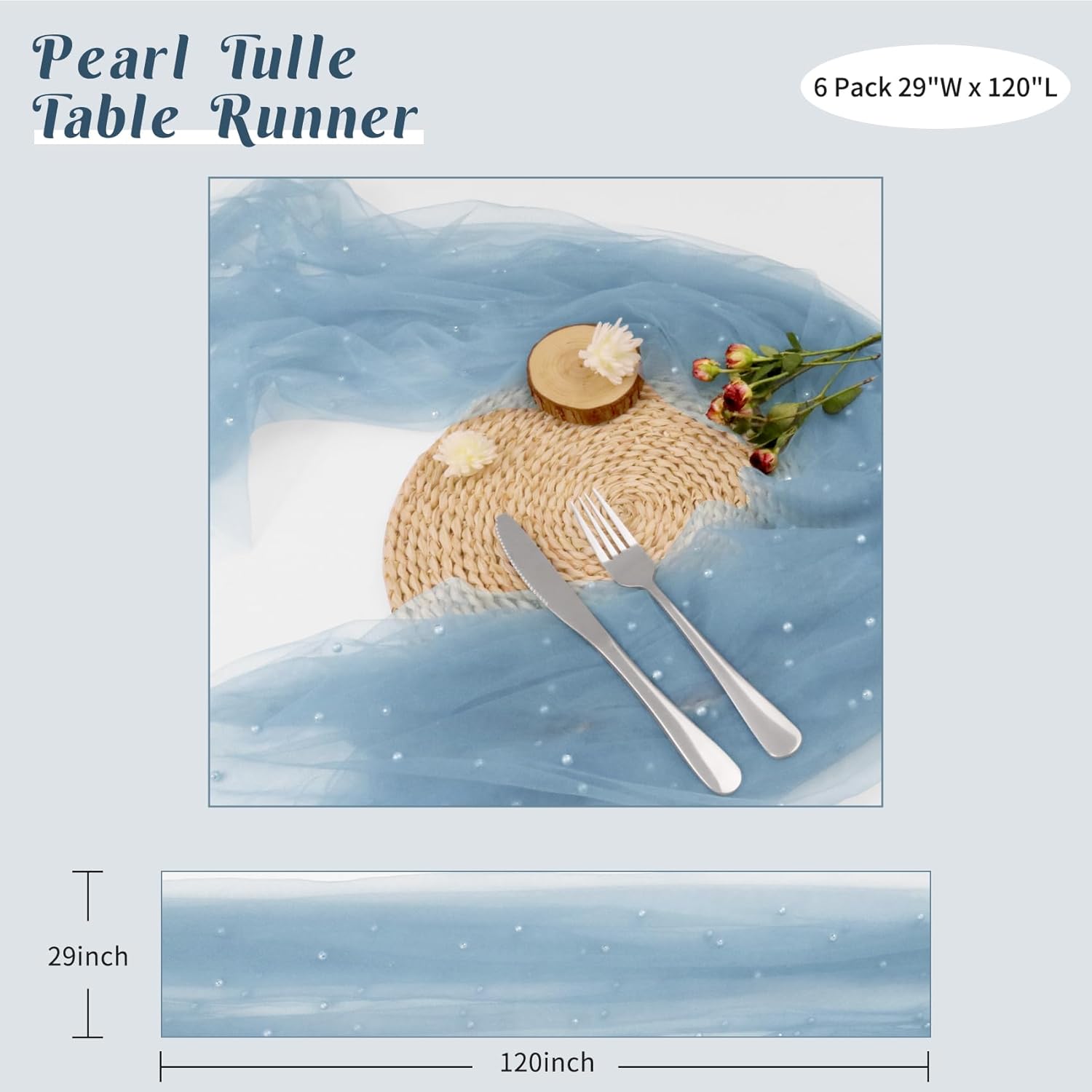 Set of 6 Pearl Table Runner 29 x 120 Inch Dusty Blue Tulle Fabric Lace Table Runners Boho Rustic Table Runners for Bridal Shower Birthday Party Wedding Arch Aisle Veil Dessert Table Decor(Dusty Blue)