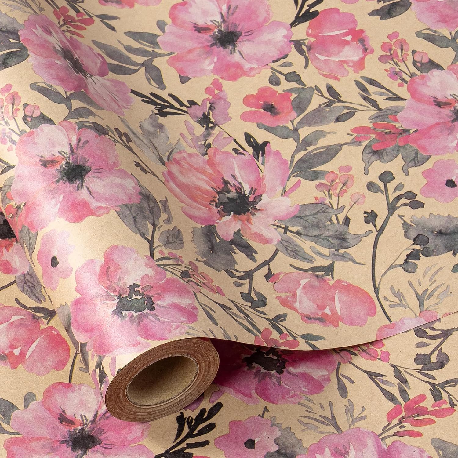 RUSPEPA Pink Wrapping Paper Roll, 17 in x 16.4 ft, Mini Roll, Floral Wrapping Paper, Kraft Gift Flower Paper for Women, Girls, Spring, Summer, Wedding and Engagement