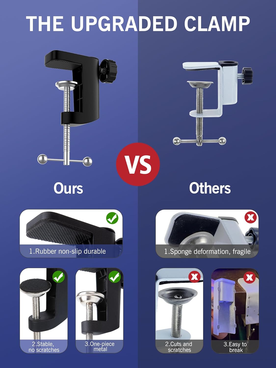 • Table Clamp Base - Suspension boom arm comes with one desk clamp, can easily clip to any desktop up to 1.8"/4.5cm thick. The sponge on the mic stand desk base could protect your desk without any scratches when you swivel side screw.