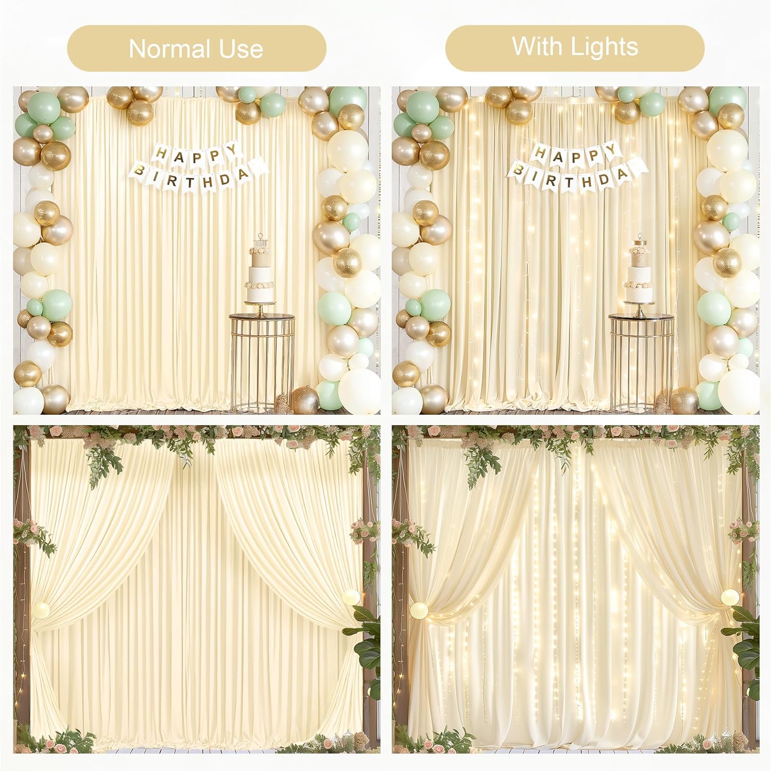 • Beige Backdrop Curtains with Lights for Parties - Our champagne backdrop curtain can be used indoors and outdoors, they are perfect for baby shower, birthday party, wedding, graduation ceremony, dessert tables, anniversary, New Year's Eve party, stages photography or any other important events. It is also a good choice to use this champagne backdrop curtains for photoshoot.