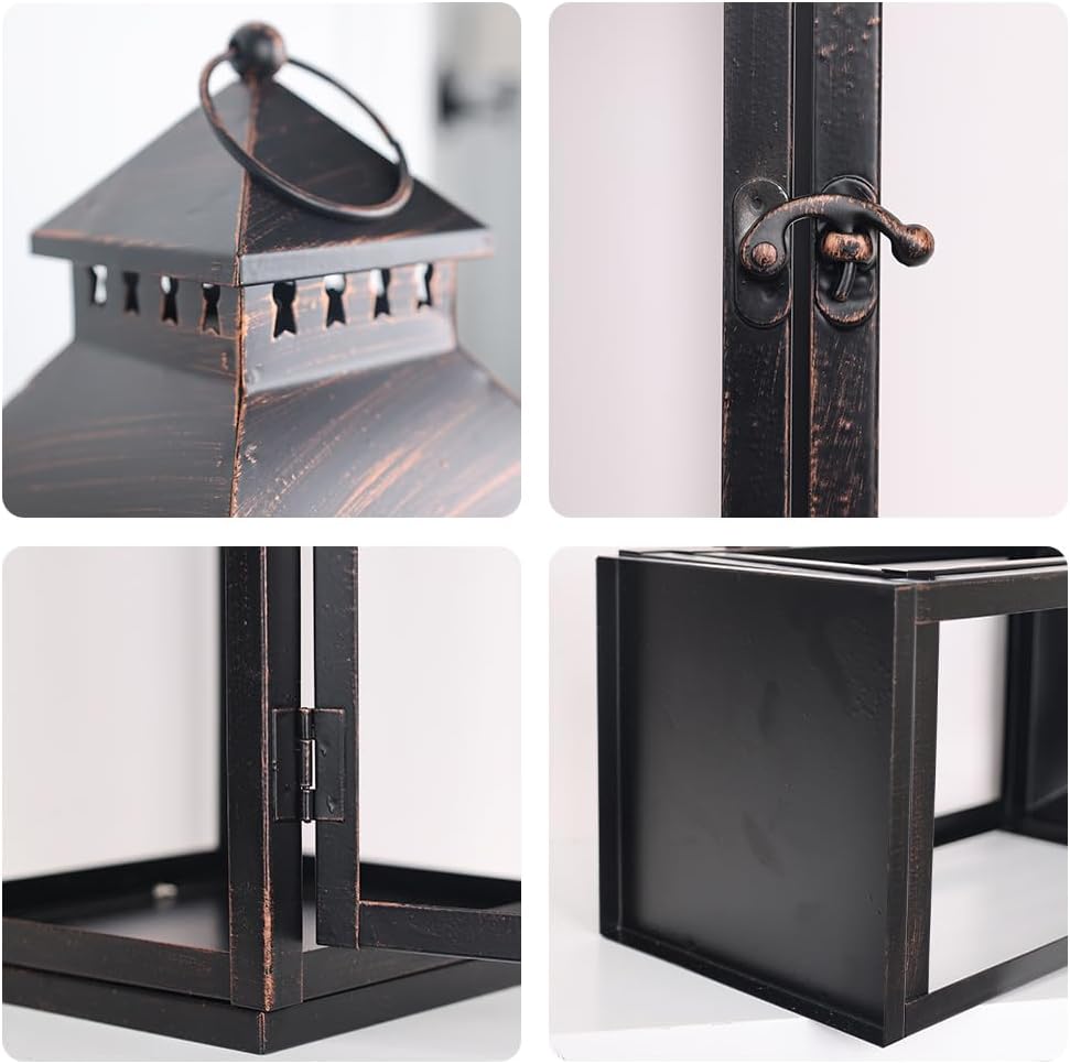 • Inspired Design with LED Candles——The combination of multiple sets adds a variety of possibilities to your home decor. The antique metal paint design combined with black and gold colors make them the perfect addition to the porch, patio and garden. You can easily place the lantern anywhere you want through lifting the top pull ring.