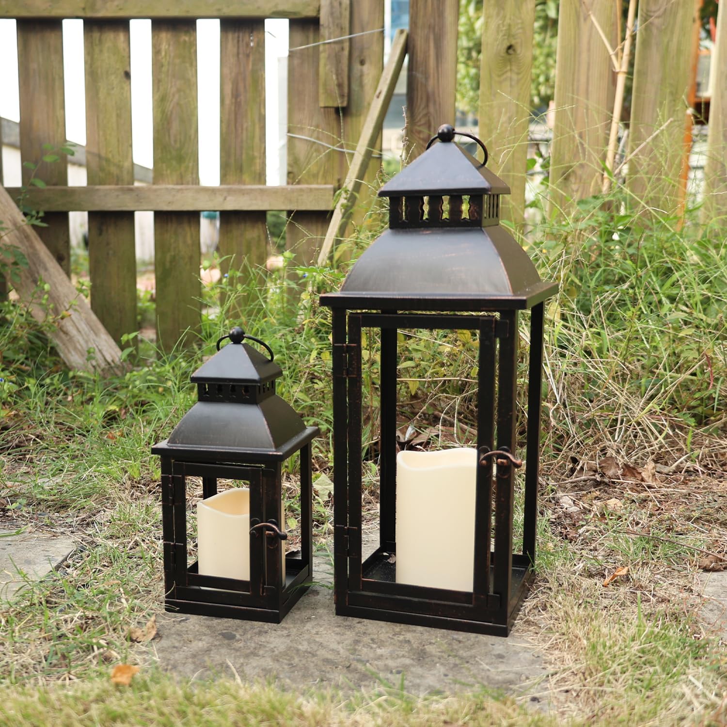 • Suitable for Most Outdoor Scenes——The set of 2 Large Bronze vintage LED candle lantern is perfect for outdoor use. The metal material with LED candles can withstand wind and rain which allows you to see the bright, flickering candles, creating a fantastic atmosphere. (NO GLASS)