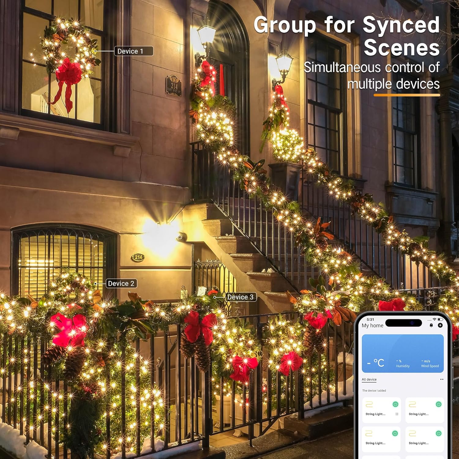 • Smart APP & Hands-free Voice Control: Use the App to access groups, scheduling, audio-sync, multiple modes, and more. Use Amazon Alexa or Google Assistant to control your smart string lights with just your voice. Simple voice commands let you turn lights on and off, dim and brighten, etc.