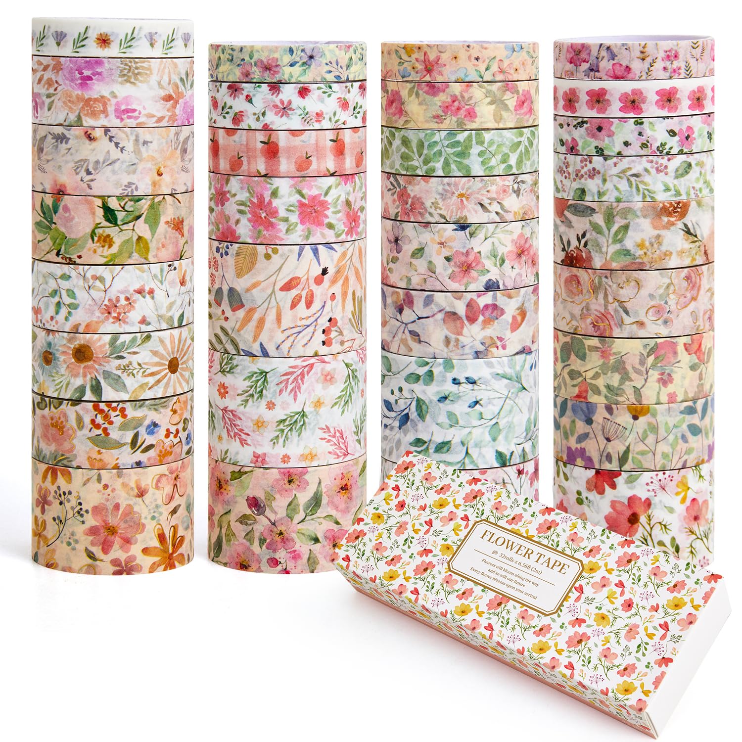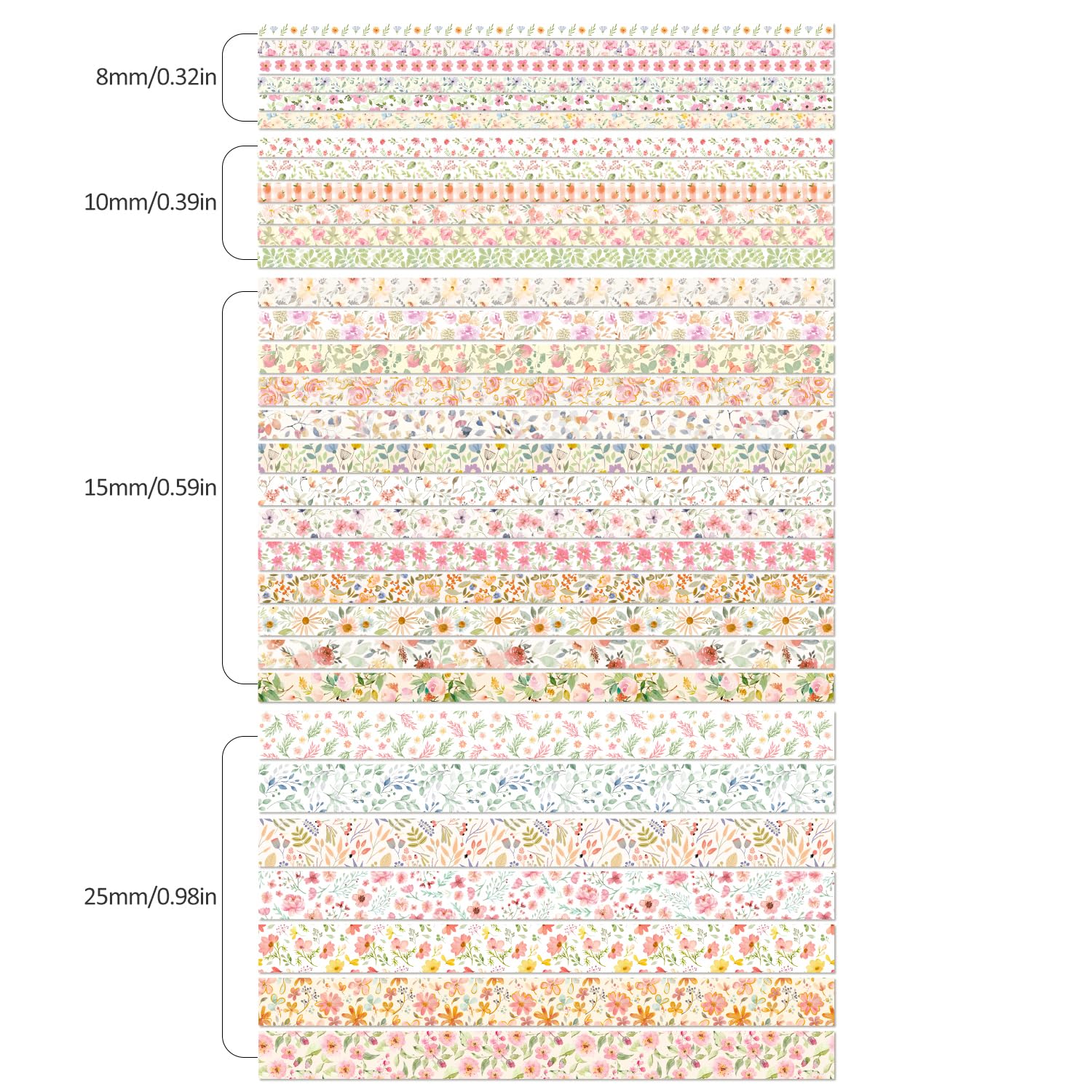 • [32 Rolls floral designs] 32 Rolls Washi Tape, 0.31 inch(8mm)wide x 6 Rolls, 0.39 inch(10mm) x 6 Rolls, 0.59 inch(15mm)wide x 13 Rolls, 0.98 inch(25mm) x 7 Rolls, each roll is 2m.32 different patterns, this oil painting washi tape adds color and vitality to the pasted items, making daily life more interesting.