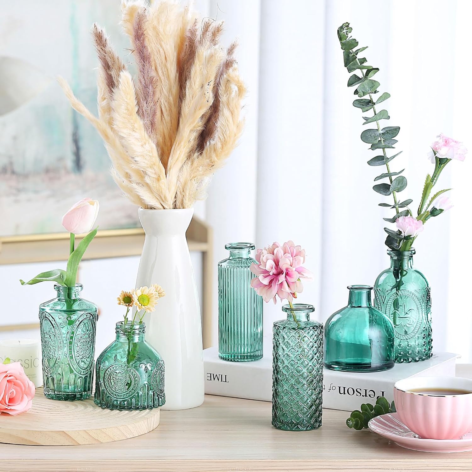 • Exquisite Craftsmanship: Crafted from premium-quality glass material, our bud vase set ensures both durability and elegance. The smooth bottle mouth offers a comfortable touch, while the thickened bottom provides enhanced stability. Adorned with unique etched patterns, these vases exude a timeless vintage charm, seamlessly blending into various room aesthetics.