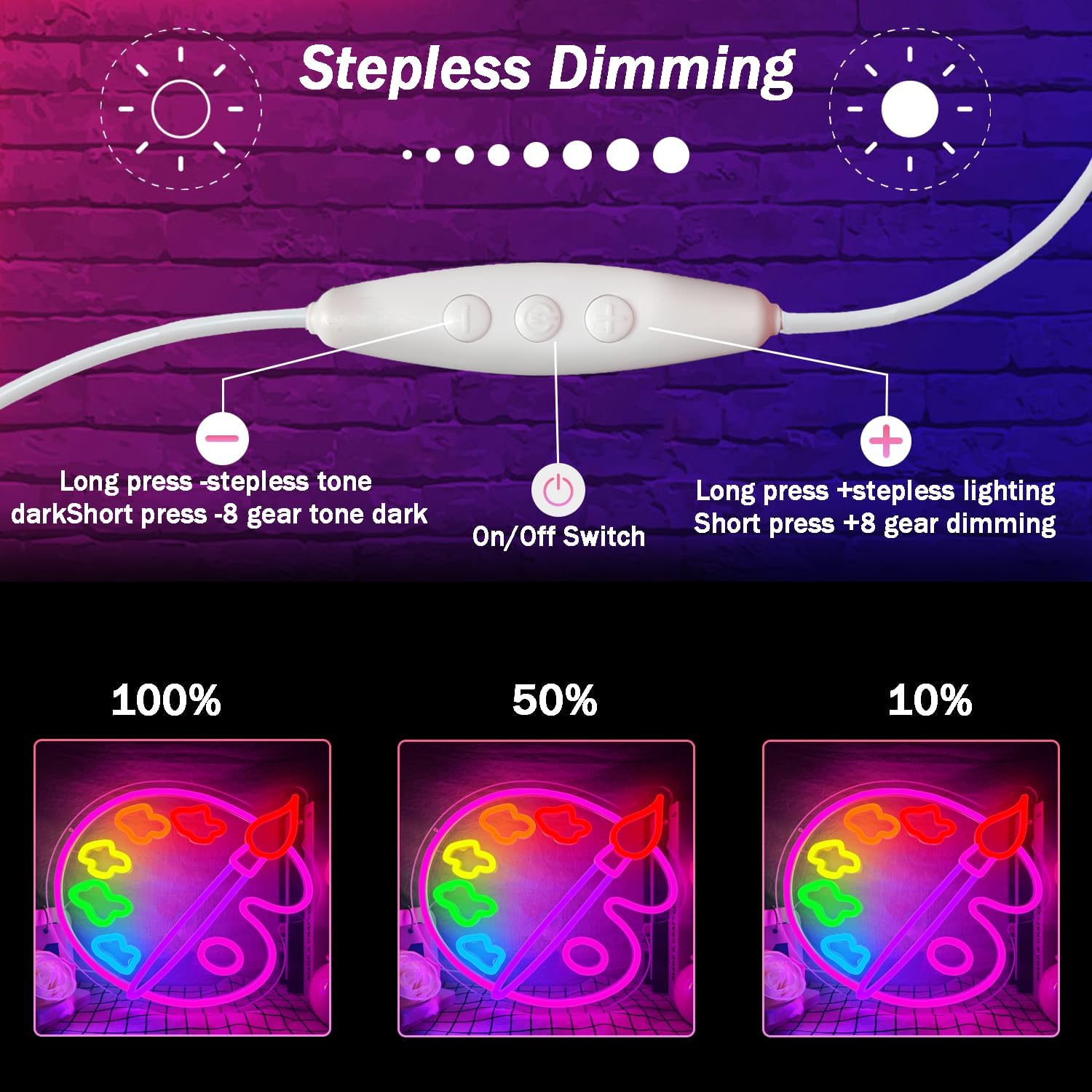 • 【Adjustable Brightness】This Paint Palette LED neon lights is equipped with a built-in dimmer, which can easily adjust the brightness. Whether you like soft light to create a warm atmosphere, or need bold light to highlight your personality, it can meet your needs. You can fully control the intensity of the lighting to create the ideal light and shadow effect for any occasion.