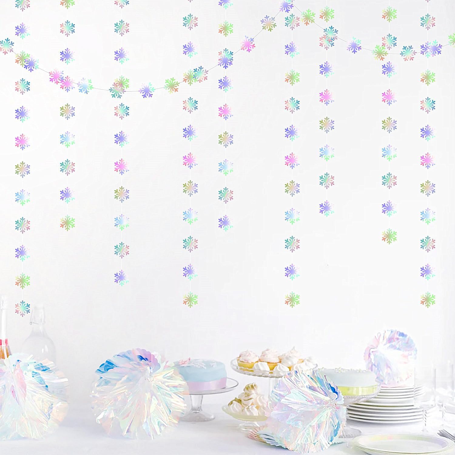 • 【Wide Use】These streamers garland are great for indoor and outdoor events such as christmas ornaments,frozen glitter birthday party ,winter wonderland decorations,snowflake decorations,disco iridescent dance party,euphoria party,baby shower ceiling decorations.