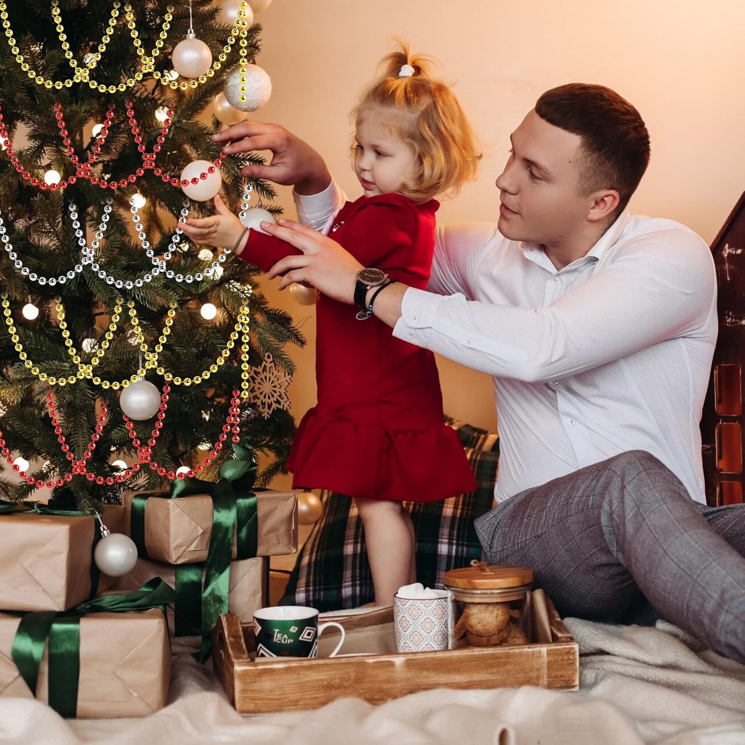 • Faux Pearl Beads Garland: Faux pearl rolls can be cut to the desired length. You can easily adjust the pearl strand length and cut to any length you need for your ornaments or DIY crafts. Each pearl is melted on a sturdy nylon cord, so it won't scatter, and it's easy to handle