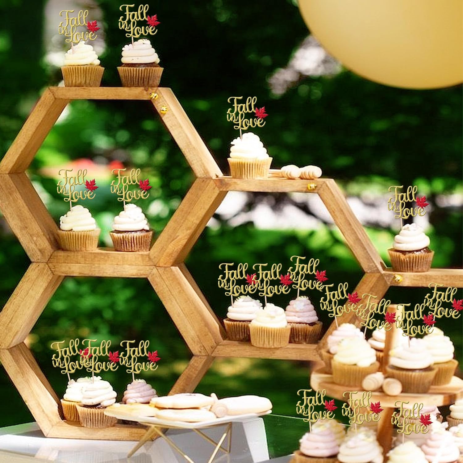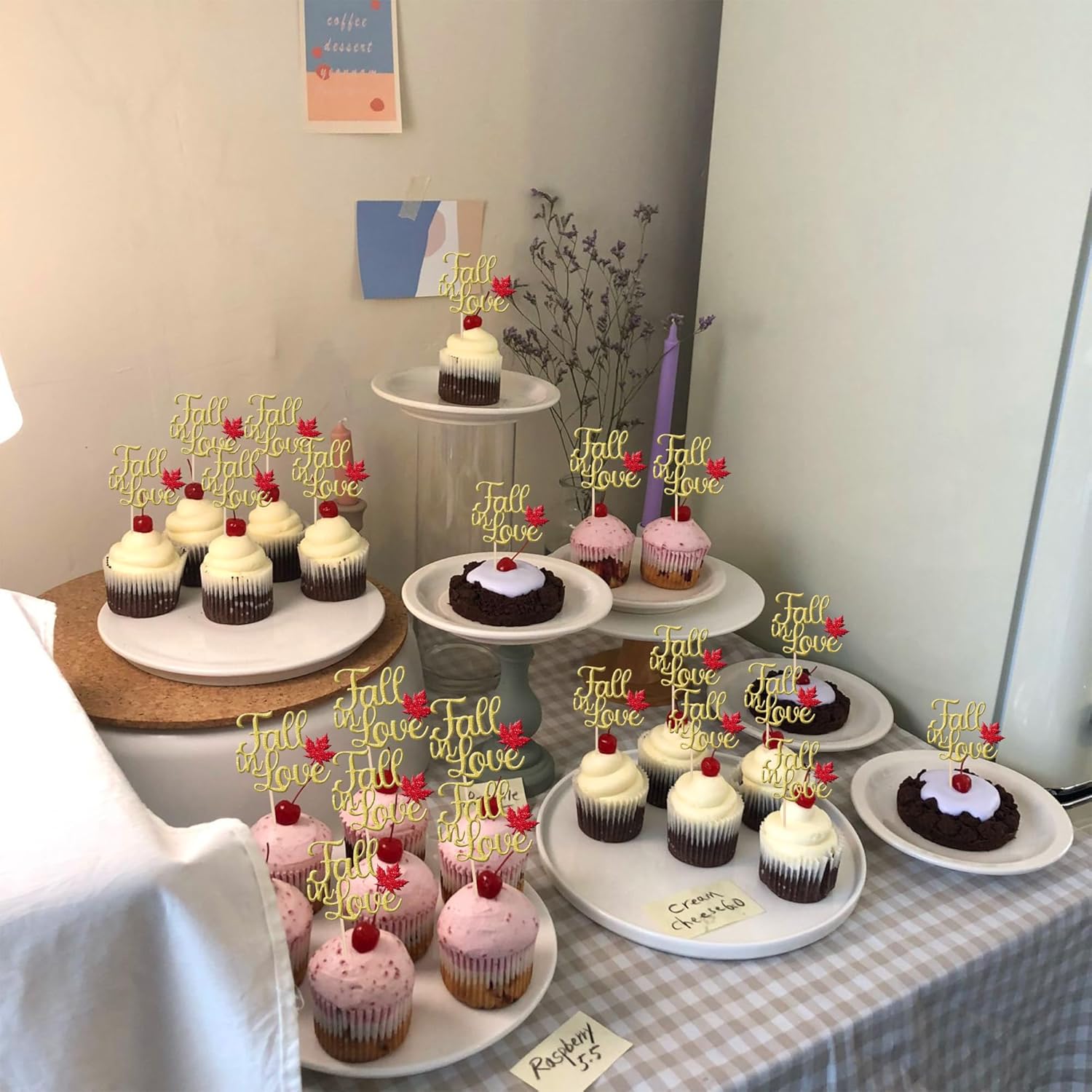 24 PCS Fall in Love Cupcake Toppers Glitter Maple Leaf Fall Theme Bridal Shower Cupcake Picks Wedding Engagement Cake Decorations for Autumn Wedding Anniversary Bridal Shower Party Supplies Gold