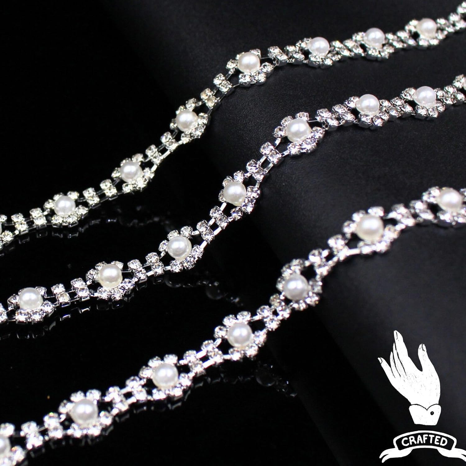 2 Yard Pearl Trim Chain Rhinestone Silver String Crystal Applique Fringe Ribbon Strips Beads Sewing Dress DIY Party Wedding Bouquet for Decoration Bridal Costume Embellishment