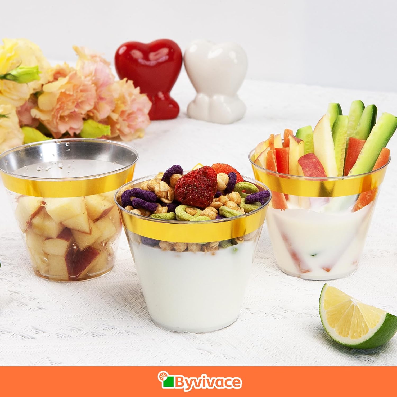 50counts 9 OZ. Disposable Cups Old fashioned Party Tumblers, 9 Ounce Squat Cups Gold Wine Glasses Hard Plastic Cups with Gold Rim