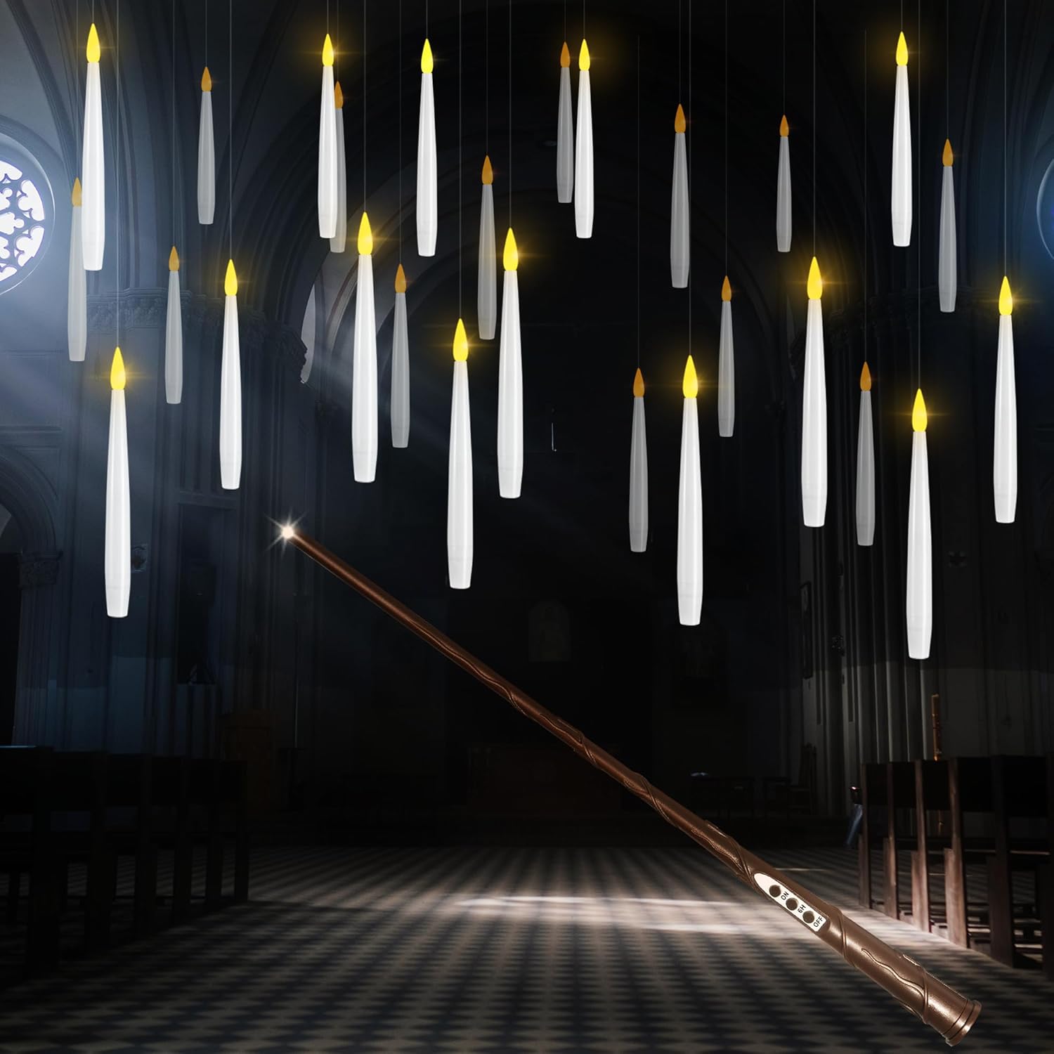 • đź”®MAGICAL GIFTS FOR FAMILIESđź”® Different from other floating candles, our magic LED candles have 2 lighting modes: Always on and flicker like real candles. Use your magic wand to control the candles and practice your magical skill. 3D realistic flicker design looks like a real taper candle flame flickering. Meanwhile, there is absolutely no fire or burning danger, you will have perfect ambient evenings with peace of mind.
