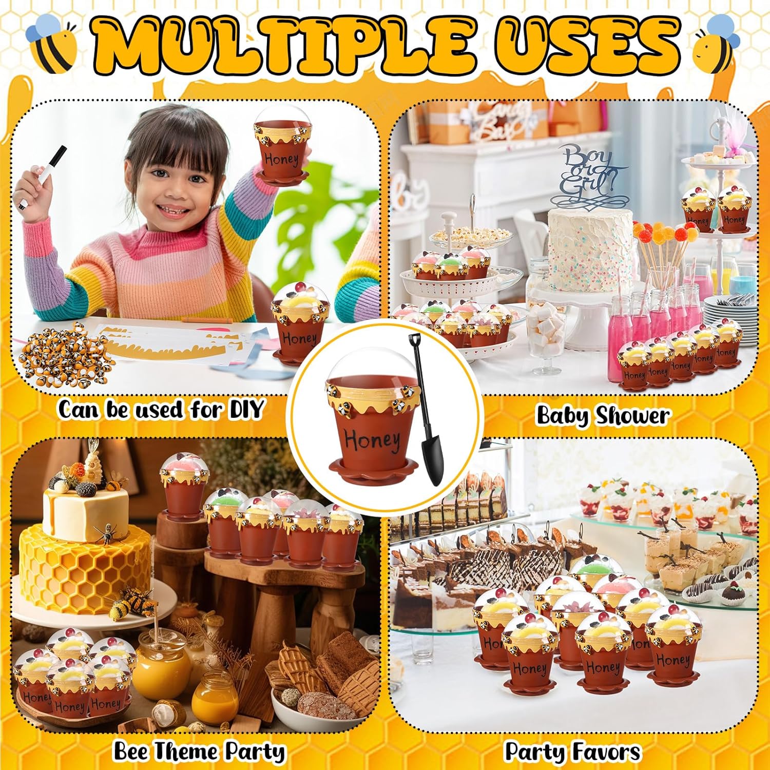 • Package Contains: includes 30 mini honey bee pots, 30 lids, 30 saucers, 30 shovel shaped spoon, 30 stickers, 120 wooden yellow bee decorations, 4 erasable markers, 2 indelible markers, ideal for DIY gifts, unleash your artistic talent to create a special and vibrant display, add fun to your bee party, birthday party, baby shower
