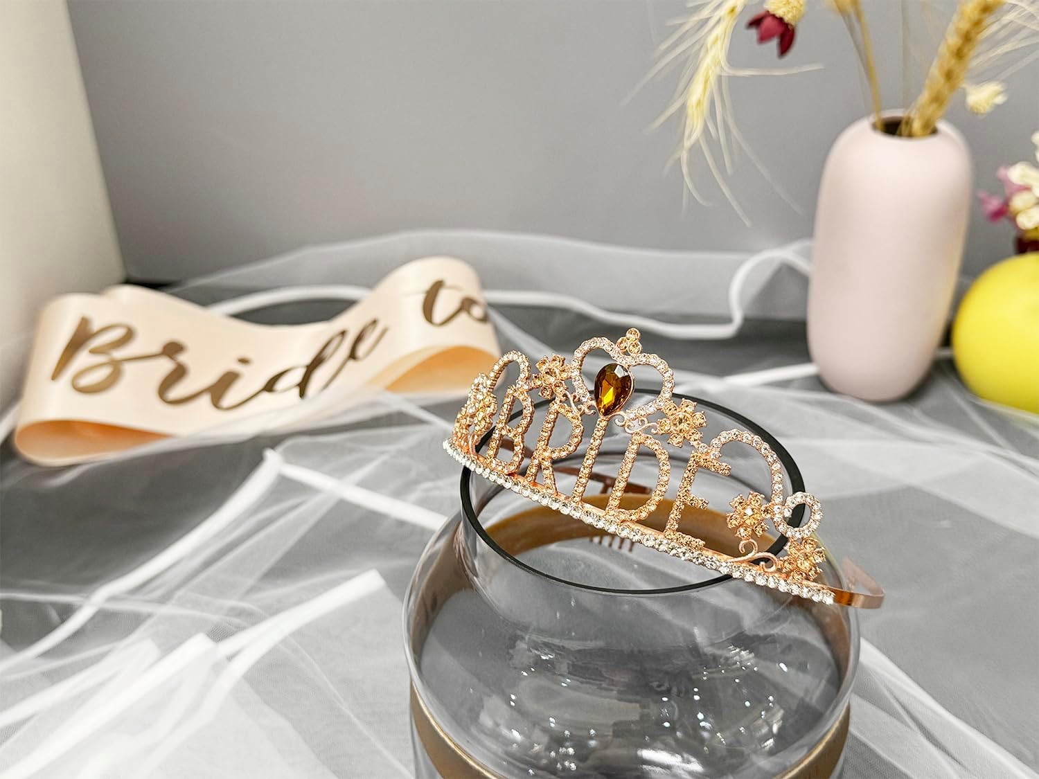 • PACKAGE INCLUDED - 1× satin edged veil with comb and 1× bridal shower decorations "BRIDE" crown and 1 × "Bride to Be" sash (Rose Gold, Set of 3)