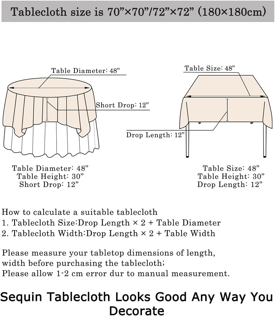 • SIZE OF SEQUIN TABLECLOTH : 2 pack 72x72 Inch gold Sequin Tablecloths Table Linen, this small square tablecloth is fit for a 4FT round or square table.