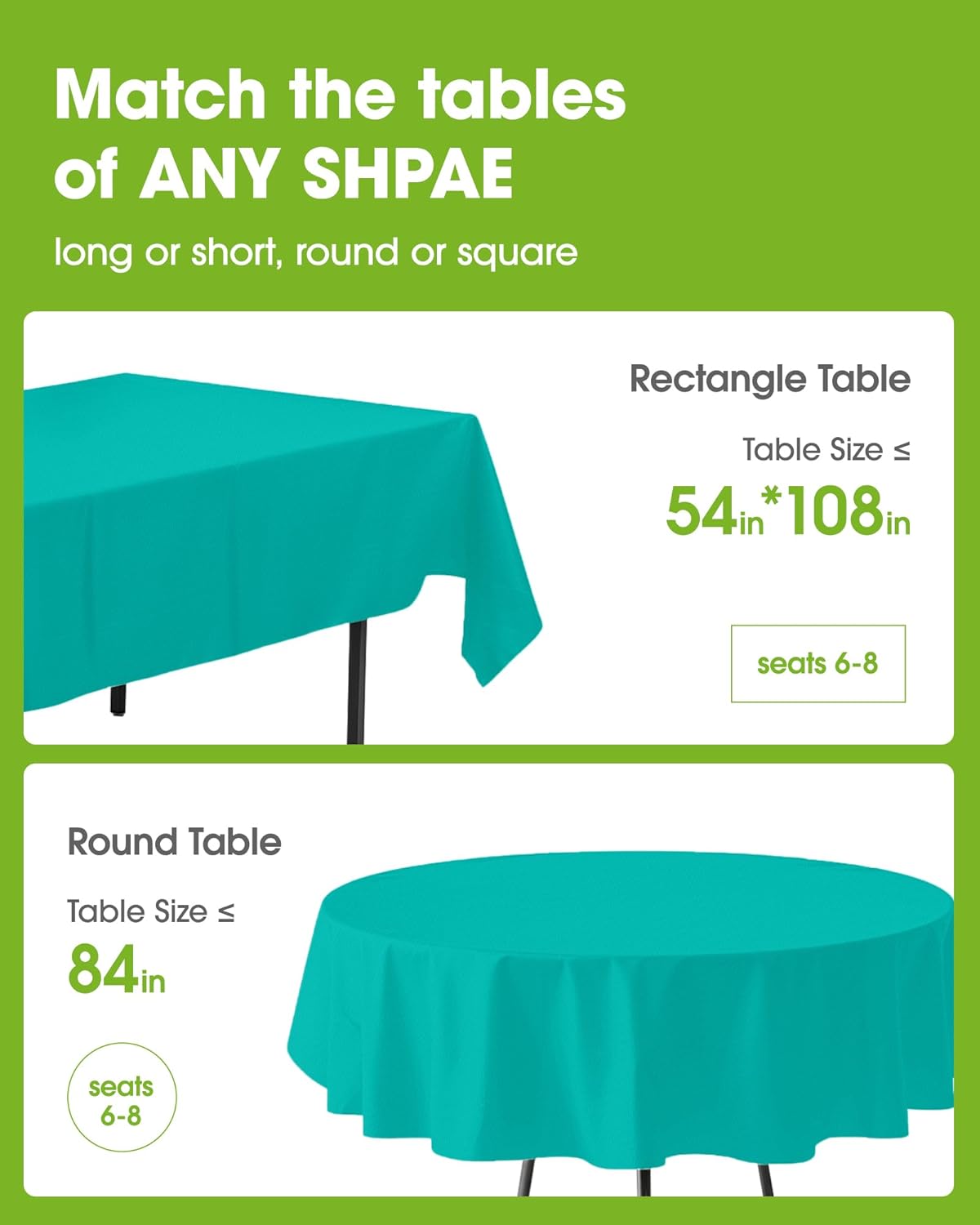 • FIT ANY SHAPE OF TABLES: Pureegg disposable tablecloths for rectangle tables measure 54" x 108" and fit tables up to 8 feet long. These plastic table cloths also fit smaller tables or various kinds of tables, like folding buffets, outdoor picnic, kitchen, and dining tables.