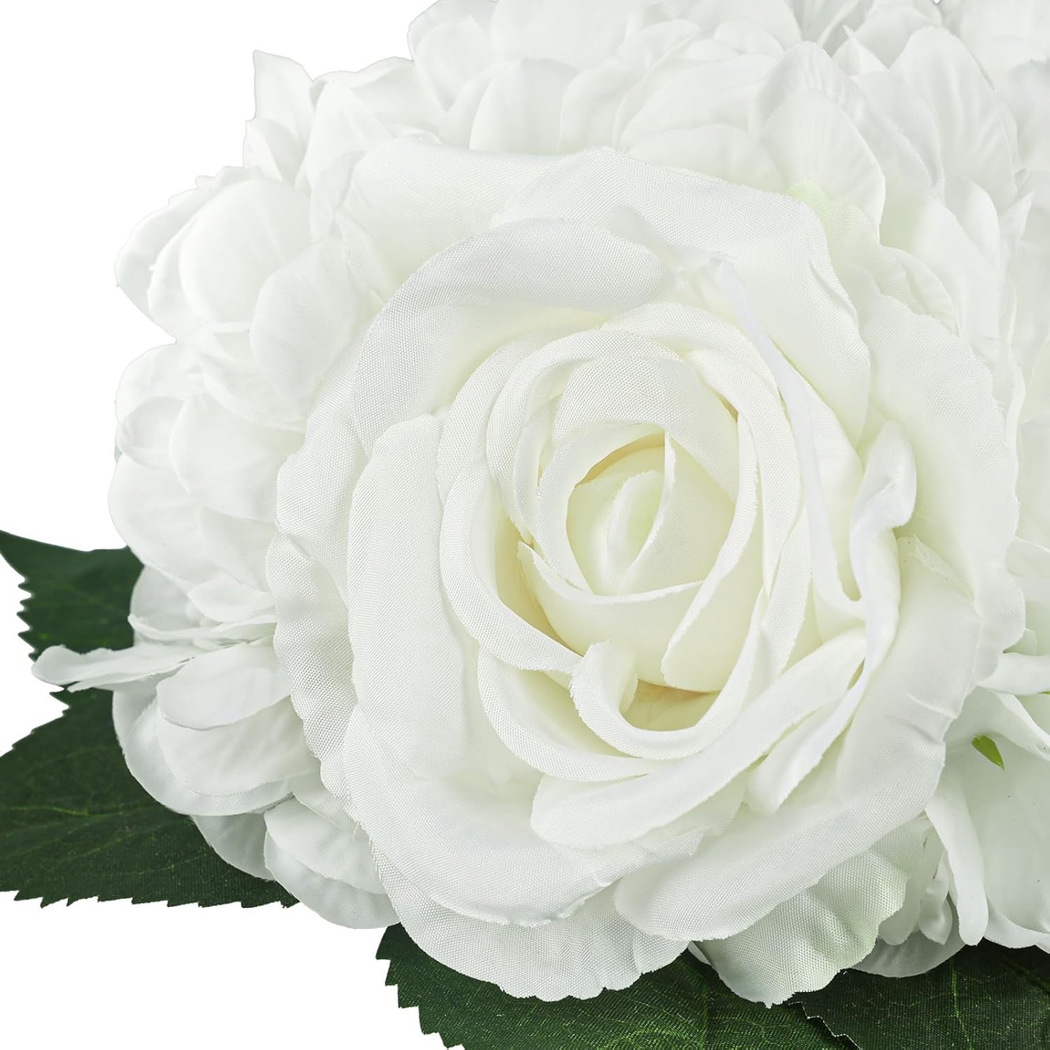 • Add Beautiful Roses: We added two roses to decorate the fake hydrangea flowers, matching the color of the three white artificial hydrangea flowers,each hydrangea flower has 80 petals,5 heads the design is not only unique, but also beautiful full.Fluffy fake flowers petals paired with 6 leaves, more realistic