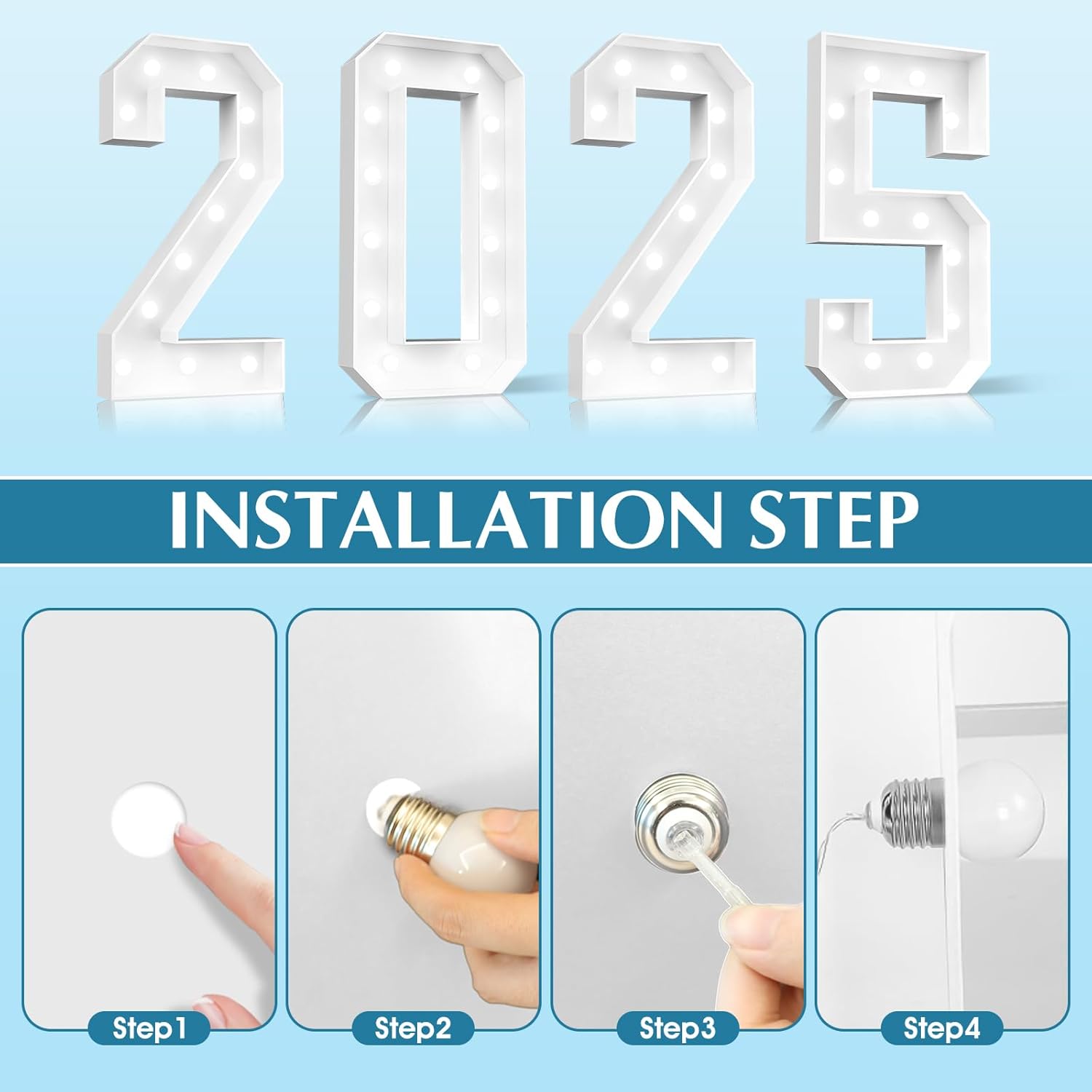 • 【Assembly Required】Each marquee number is made of precisely pre-cut foam board, comes with the same model of light string and LED bulb, and a user-friendly instruction manual. According to our installation manual, ① Fold the side panels along the cutting line and stick them to the bottom panel with hot melt glue according to the corresponding number. ② Screw the bulb onto the single board, and then install the LED light string into the bulb. (Note: Glue gun and battery not included)