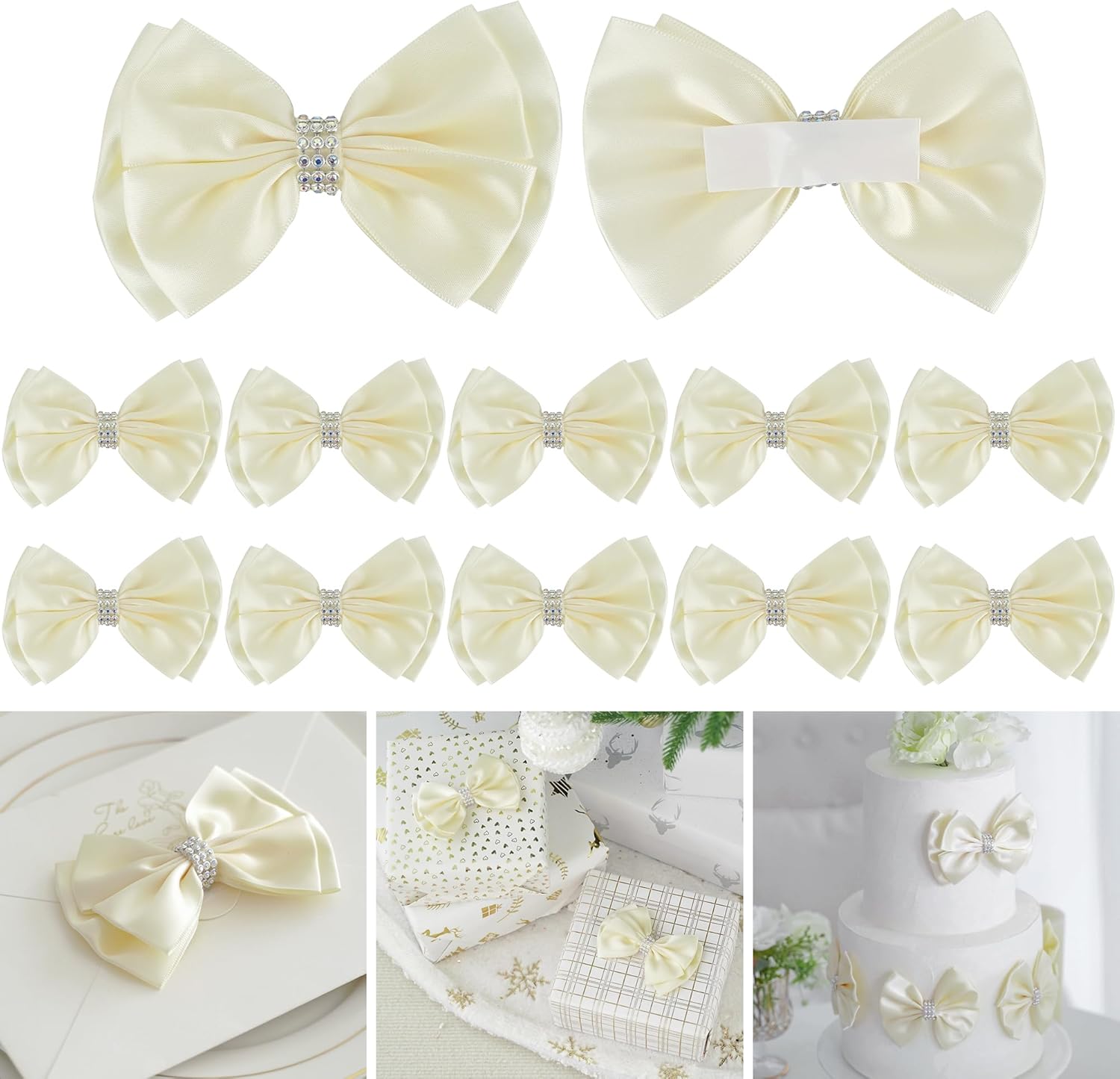 Ivory Satin Bows 4'' Premade Ivory Ribbon Bows, Gift Bows with Rhinestone, Wrapping Bows for Presents, Greeting Cards, Treat Bags, Wine Bottles, Valentines Bows for Gift Wrapping-12 Counts