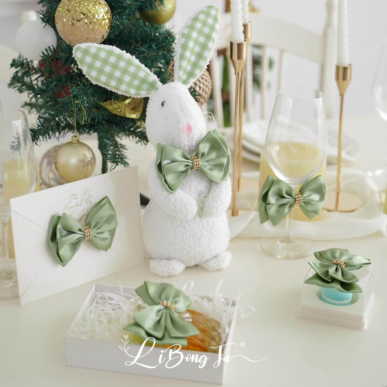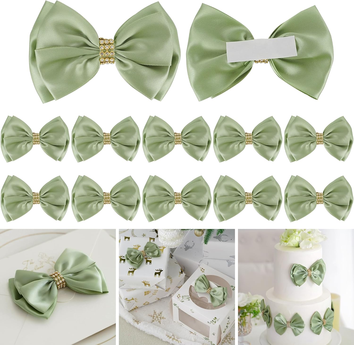 Sage Green Bows 4'' Premade Satin Ribbon Bow, Gift Bows with Rhinestone, Wrapping Bows for Presents, Greeting Cards, Treat Bags, Wine Bottles, Valentines Bows for Gift Wrapping-12 Counts