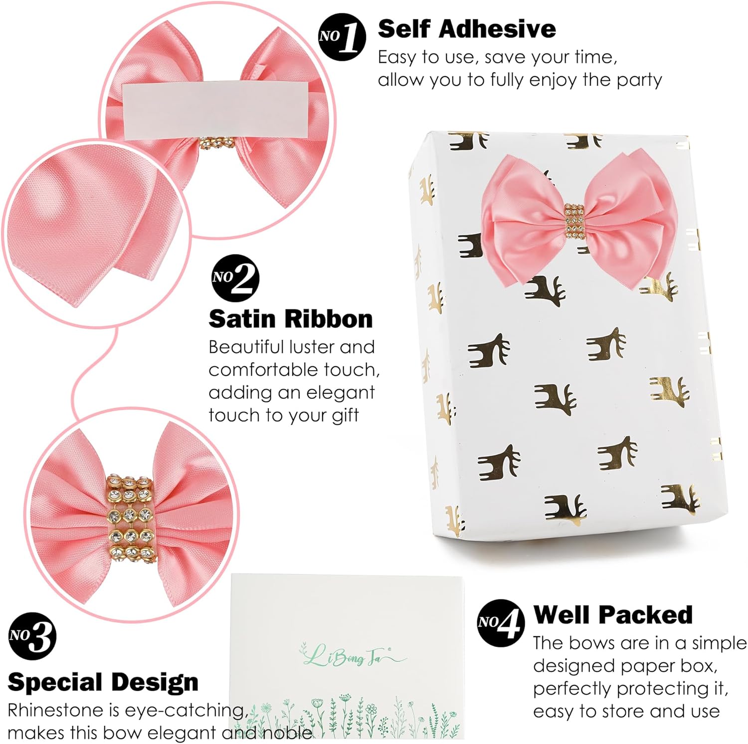 • Our premade bows design takes convenience into consideration by adding a self-adhesive paper on the back. Ready to use without the need for any other tools. This self-adhesive has high adhesion and can meet any of your needs, such as gift boxes, cards, etc
