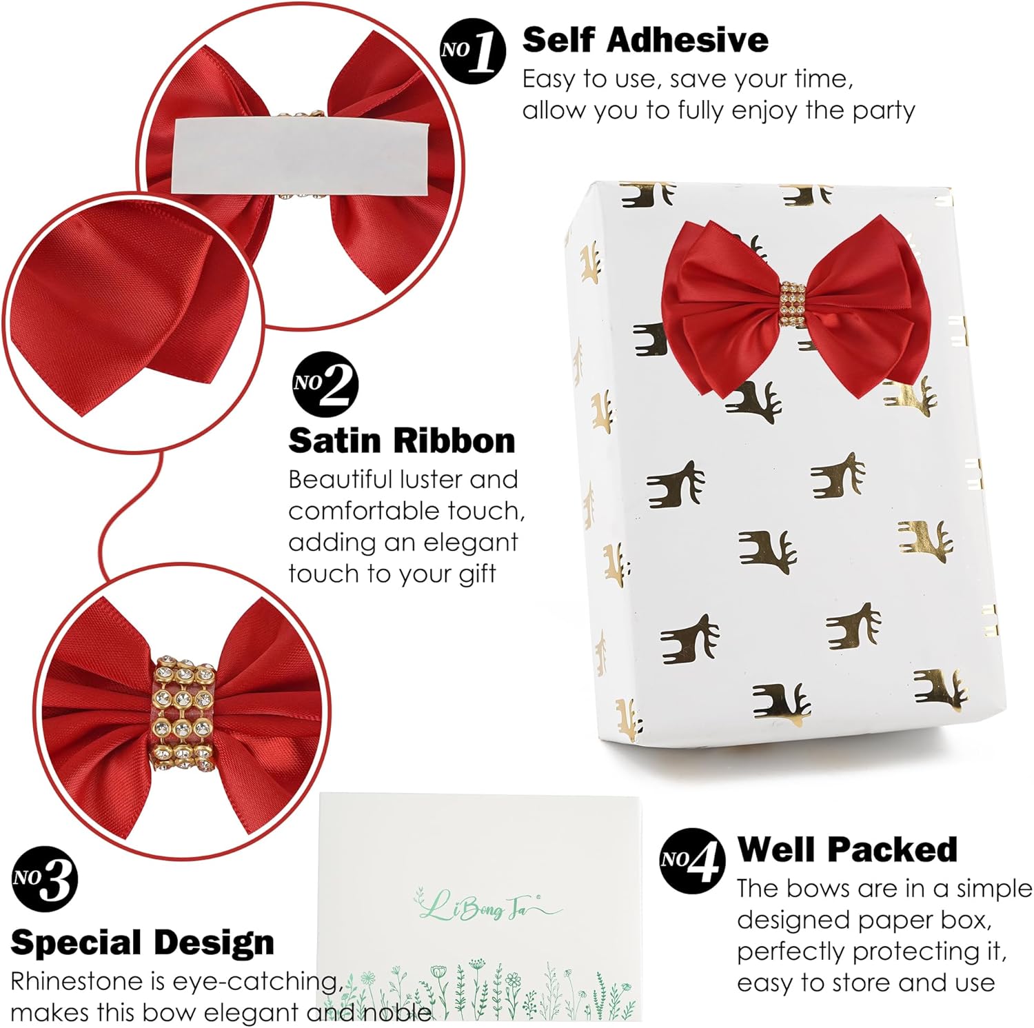 Red Bows 4'' Premade Satin Ribbon Bow, Red Gift Bows with Rhinestone, Wrapping Bows for Presents, Greeting Cards, Treat Bags, Wine Bottles, Valentines Bows for Gift Wrapping-12 Counts