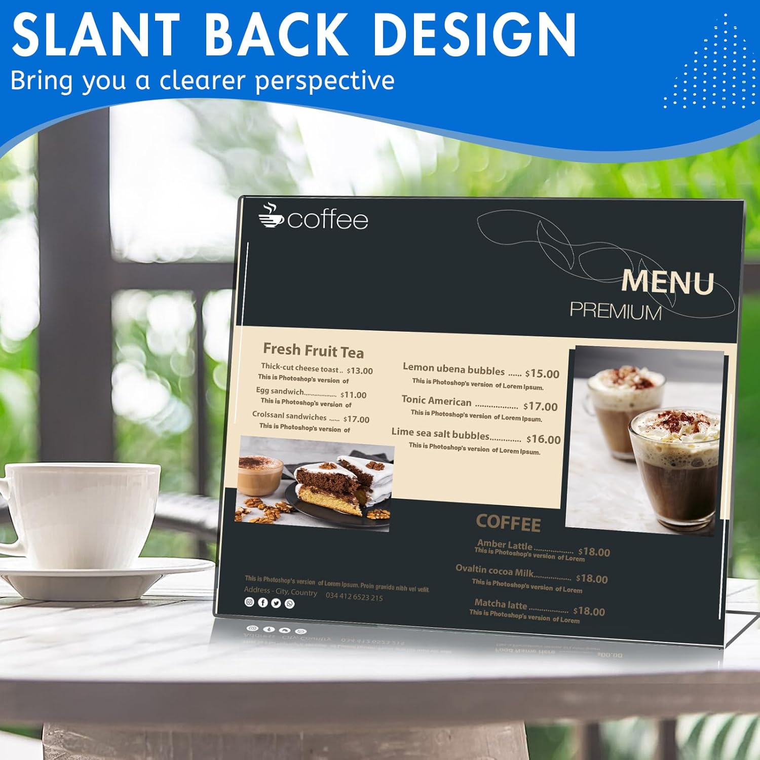 • Slant Back Design: The acrylic sign holders are designed with a slant back and tilts at a perfect angle to display the information on the paper, whether it's a guideline message or a dish. The bottom of the 8.5x11 acrylic sign holder is supported by an anti-tilt base for stability. Note: In order to ensure that you receive the most perfect plastic table sign holders, we have attached a protective film on the surface of each acrylic stand, please remove the film before use