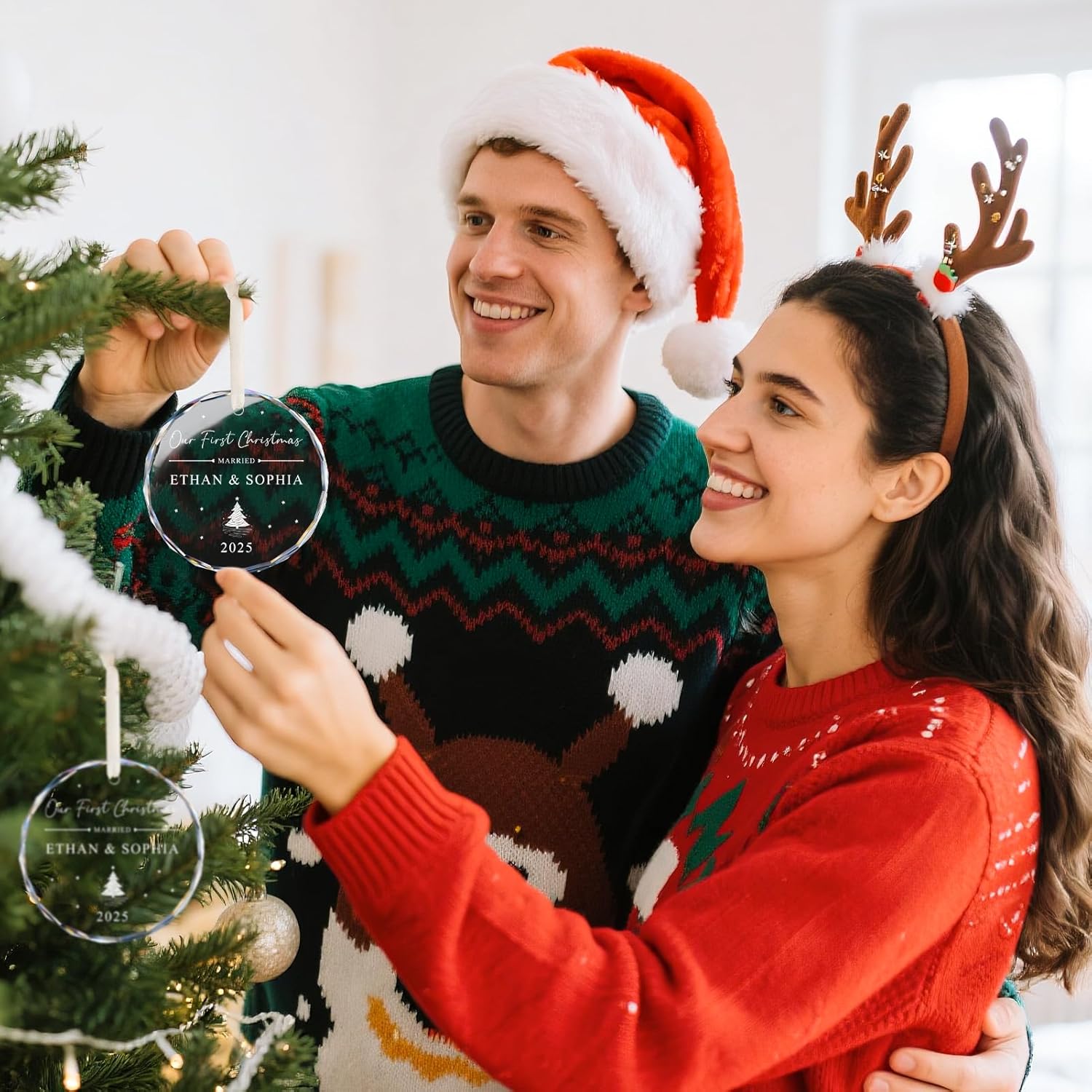 Personalized First Christmas Married Ornament 2025, 1st Year Wedding Ornament for Newlywed, Custom Christmas Ornament Hanging Decoration for Couples Just Married with Gift Box