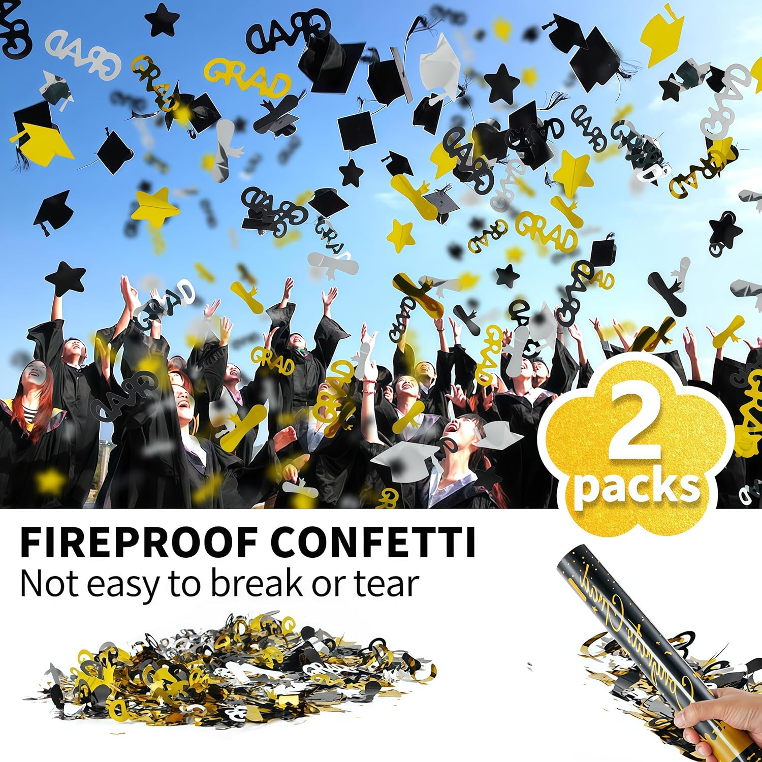 • 🎉【EXCLUSIVE DESIGN FOR GRADUATION】Celebrate graduation milestones with confetti shaped like diplomas,caps,GRAD and stars!Each popper features Graduation theme packaging to match your prom nights to diploma ceremonies, perfect for photo shoots and ceremonies 2025.