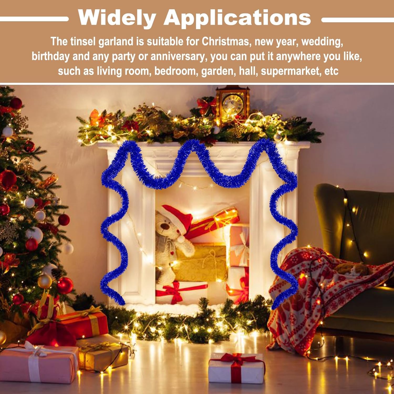 • Wide Application: Suitable for all kinds of special days, such as christmas, new year, valentine's day, halloween, festivals, wedding, engagement, bridal baby shower, graduation celebrations. The tinsel garland are perfect decorations for party, home decorations, parade float, garden, christmas tree, christmas wreath, wall, ceiling, door, hedge, stair rail, doorway, window, pole, table and so on