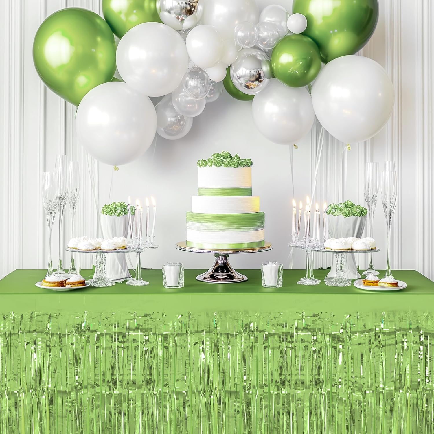 2 Pack Light Green Table Skirts, 29x108" Metallic Foil Tinsel Fringe Table Skirts for Rectangle Tables Streamer Curtains Backdrop, Party Decorations for Birthdays Weddings Holidays