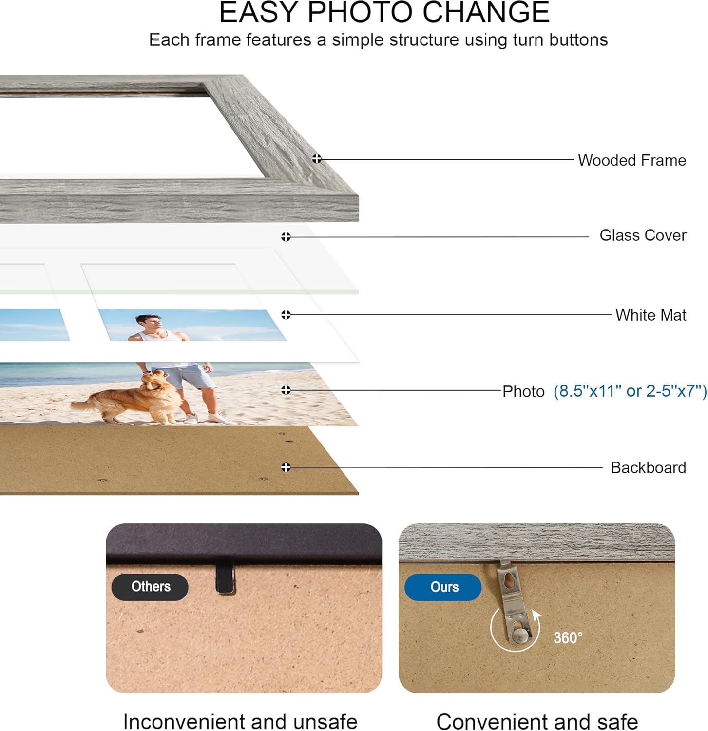 • Rustic Wood and Glass - The 8.5x11 collage picture frames made of durable MDF wood compared to other flimsy PS or plastics frames. we use tempered glass is an exceptional alternative to plexiglass, eliminating the inconveniences of bending, reflection, fragility, and susceptibility to scratches. Its edges are meticulously polished, ensuring your safety and shielding you from the harm caused by sharp glass edges.