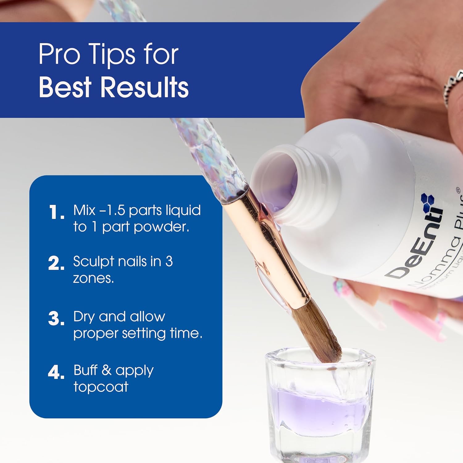 • FLEXIBLE AND COMPATIBLE, combine with DeEnti acrylic powders for superior adhesion. Acrylic liquid is also compatible with all acrylic powders from other brands.