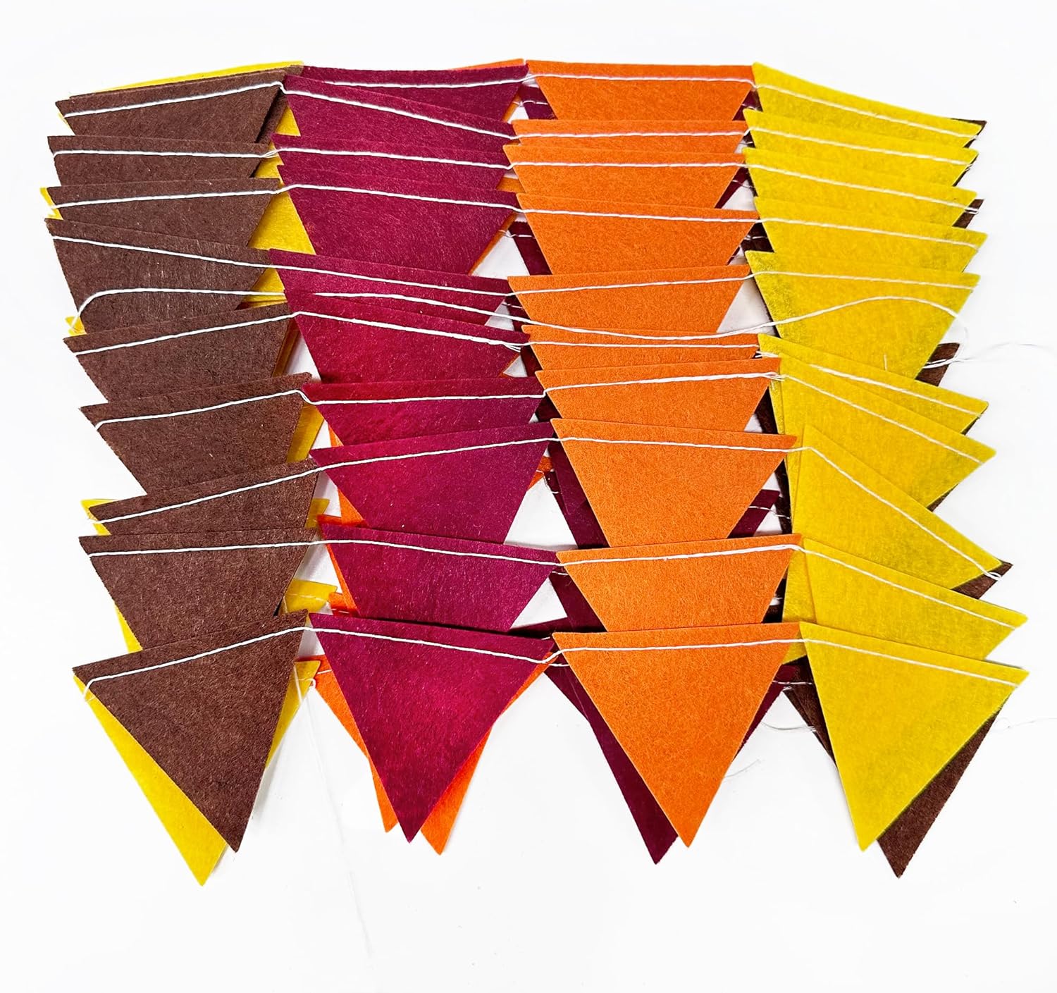 • 🟡Easy Assembly - Easy hanging and reusable.Perfect fit for fall party decor.unroll and unwrap garland carefully. due to delicate nature of thread, may tangle.This mini triangle pennant makes an attractive backdrop for videos and photos.