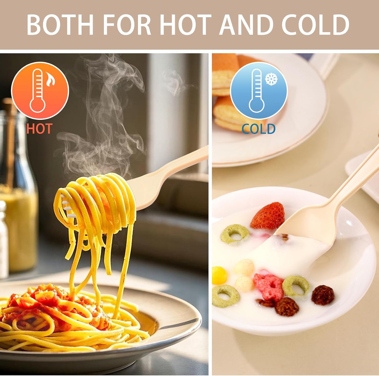 • 【Thickened Design & High-Temperature Resistance】The heavy duty disposable spoons and forks feature a thickened structure and reinforced blade tips, providing exceptional strength to withstand hard foods (meat, pasta, peanut butter) without bending or breaking. The compostable utensils have high-temperature resistance (-4°F to 212°F), making them suitable for hot soup and hot meals.