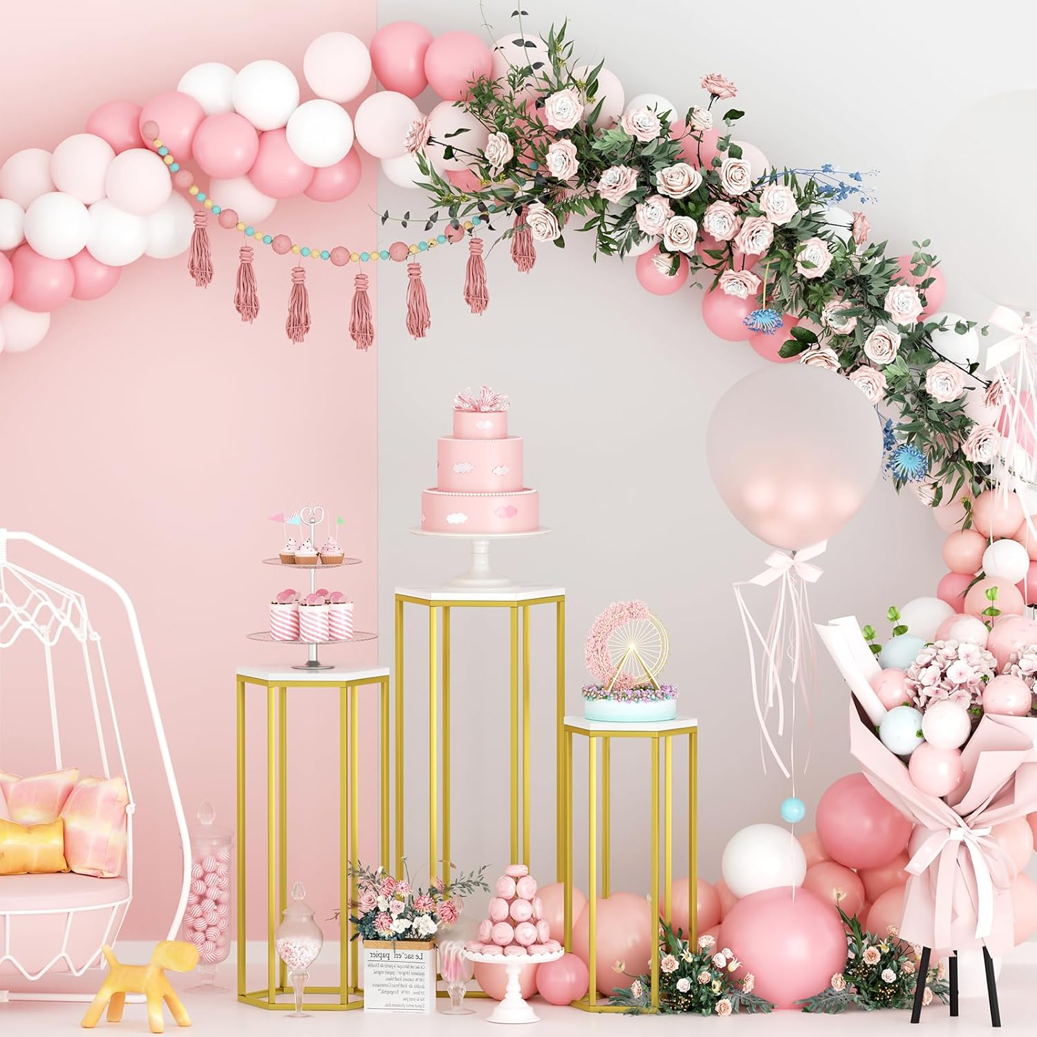 Urban Deco Cylinder Stands for Party, Set of 3 Gold Metal Hexagon Cake Pedestal Stand with Marbled Countertop, Flower Plant Pedestal Stands for Display Parties Wedding Birthday Decor, 3PCS, Gold