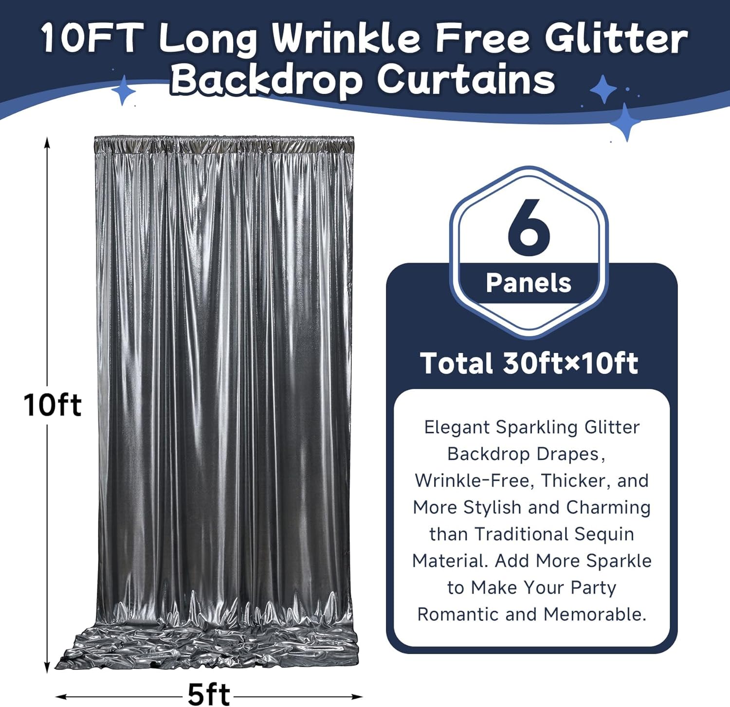 • Black Silver Backdrop Curtain 30 ft Γ— 10 ft - Your package will come with 6 panels Black Silver sequin glitter photography backdrop drapes. Each Black Silver background panels measures 5ft width and 10ft height.Entire backdrop curtain measures 30ft x 10ft.