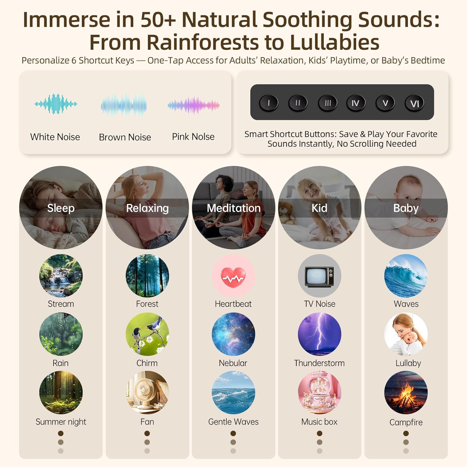• 【Applicable to All Ages People】For Adults, Kids, and Babies, Whether soothing a baby to sleep, helping a toddler relax, or creating a peaceful atmosphere for adults, this white noise sound machine is perfect for the whole family. Provides sleep and relaxation support, ideal for improving sleep quality and focus at any age.
