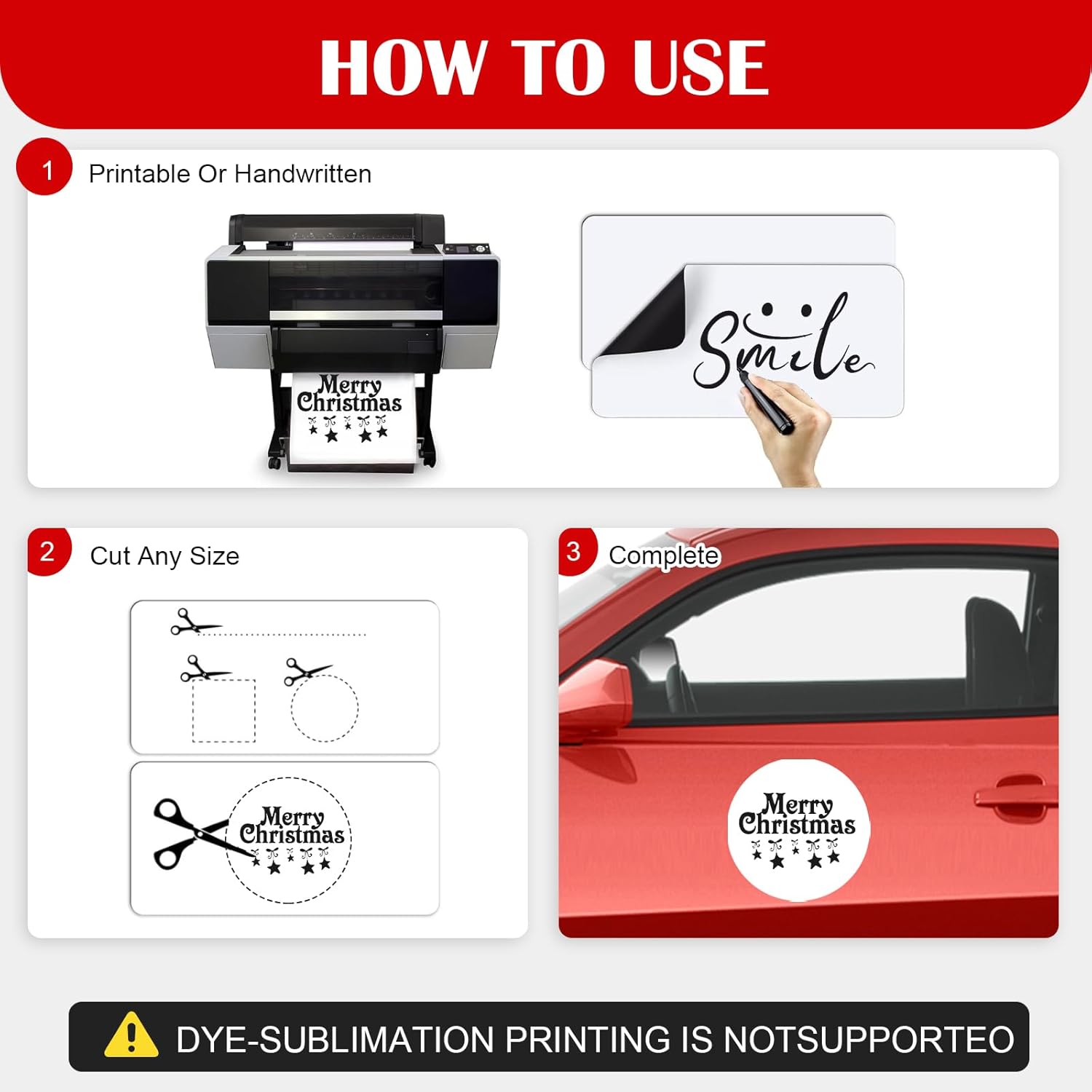 • 【CUSTOMIZATION】Blank car magnets is matte-white on the front and matte-black on the back. White car magnetic sheet are made of inkjet printable vinyl sheets and can be used with solvents, eco-friendly solvents, latex inks (or permanent markings), not compatible with sublimation printing methods. You can create a any customized logo set or personalized car magnets and decals you want.