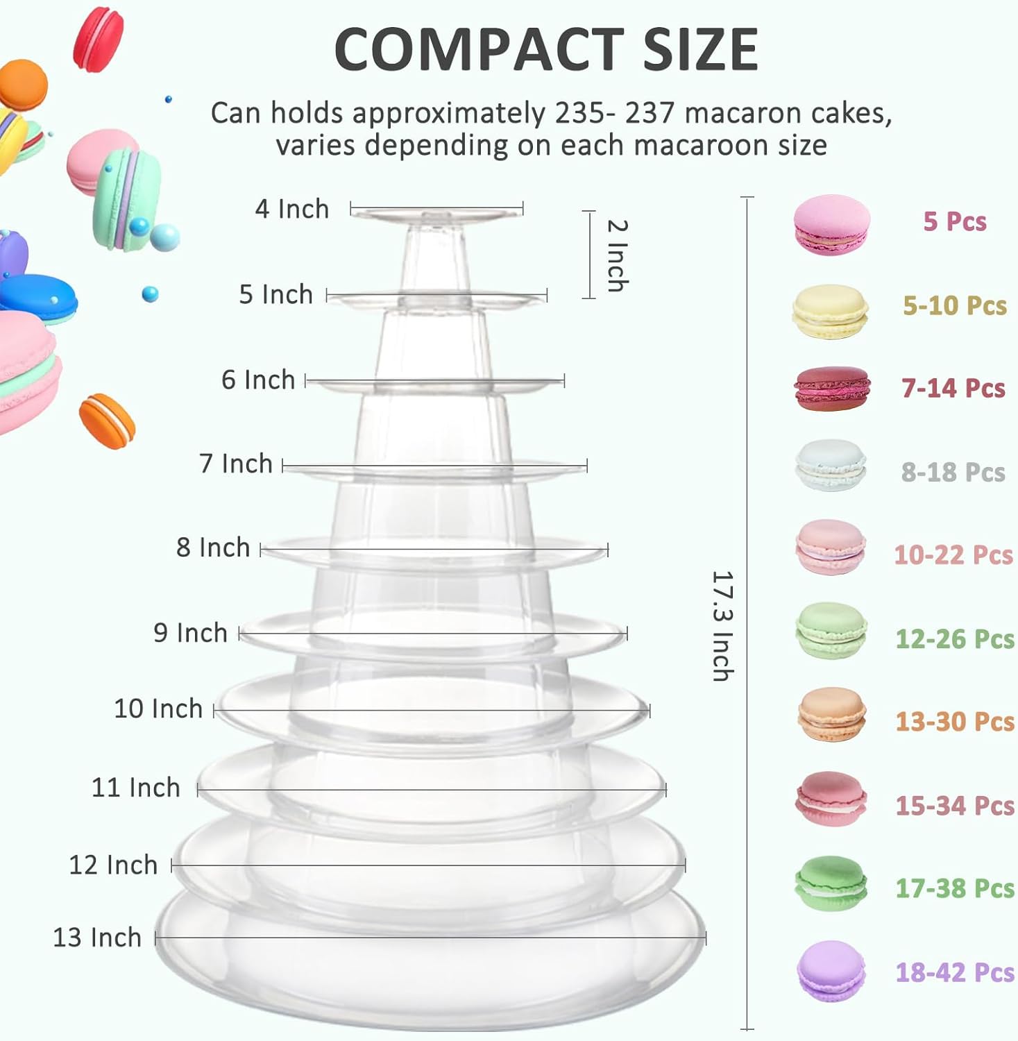 • 【COMPACT SIZE RACK】This 10 tiers cupcake display rack is about 17.3 inch in height, 4-13 inch in diameter, space between tiers is about 2 inch. Plastic tower stand can holds approximately 235-237 macaroons (depending on each macaron size and how you place it)