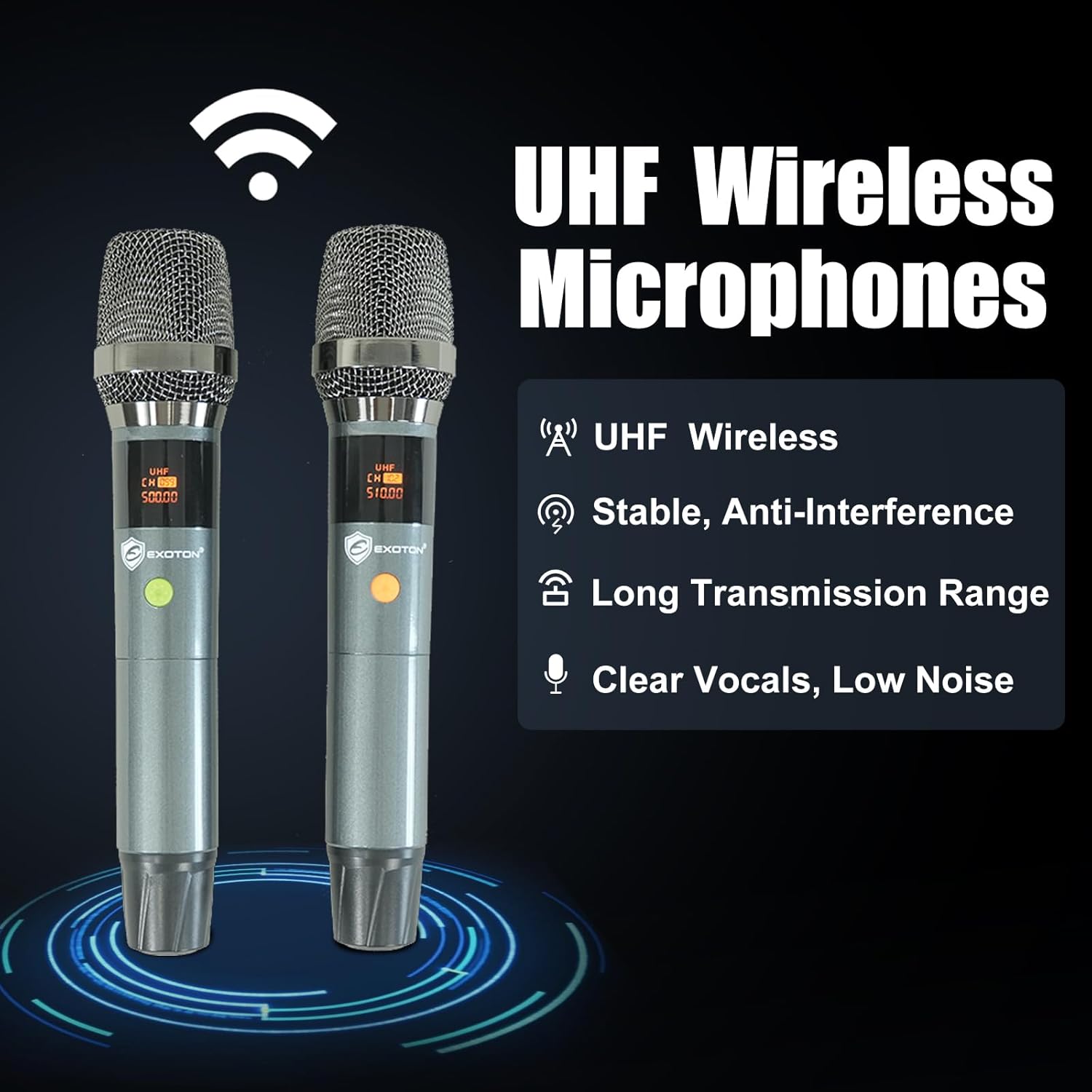 • 【UHF Microphone Inputs】The speaker system includes 2 UHF microphone inputs, allowing connection of two microphones for karaoke or live performances. The microphones are equipped with echo and noise reduction technology, providing clear and professional sound quality.