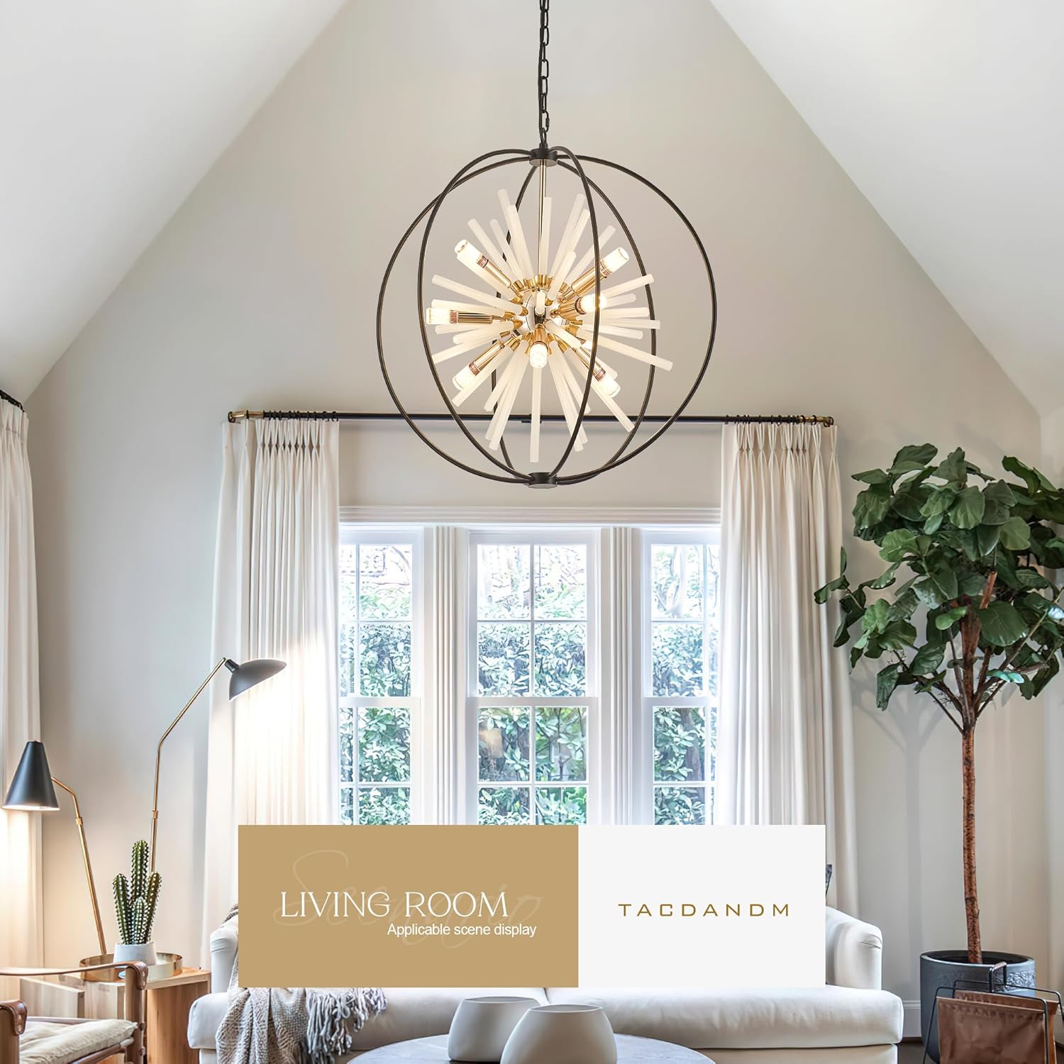 • 【Stylish Creative Design】Black Globe Sputnik Crystal Chandeliers advanced plating gold surface treatment and black metal sphere lantern, Crystal Glass Tube design, and simple 12 Lights, It can be dimmable when you used with a dimmable bulb and compatible dimmer switch. It is not just a light for lighting, but also an art for decorating, looks like fireworks. Discover a world of exquisite illumination with our modern chandeliers, where contemporary meets vintage in perfect harmony.