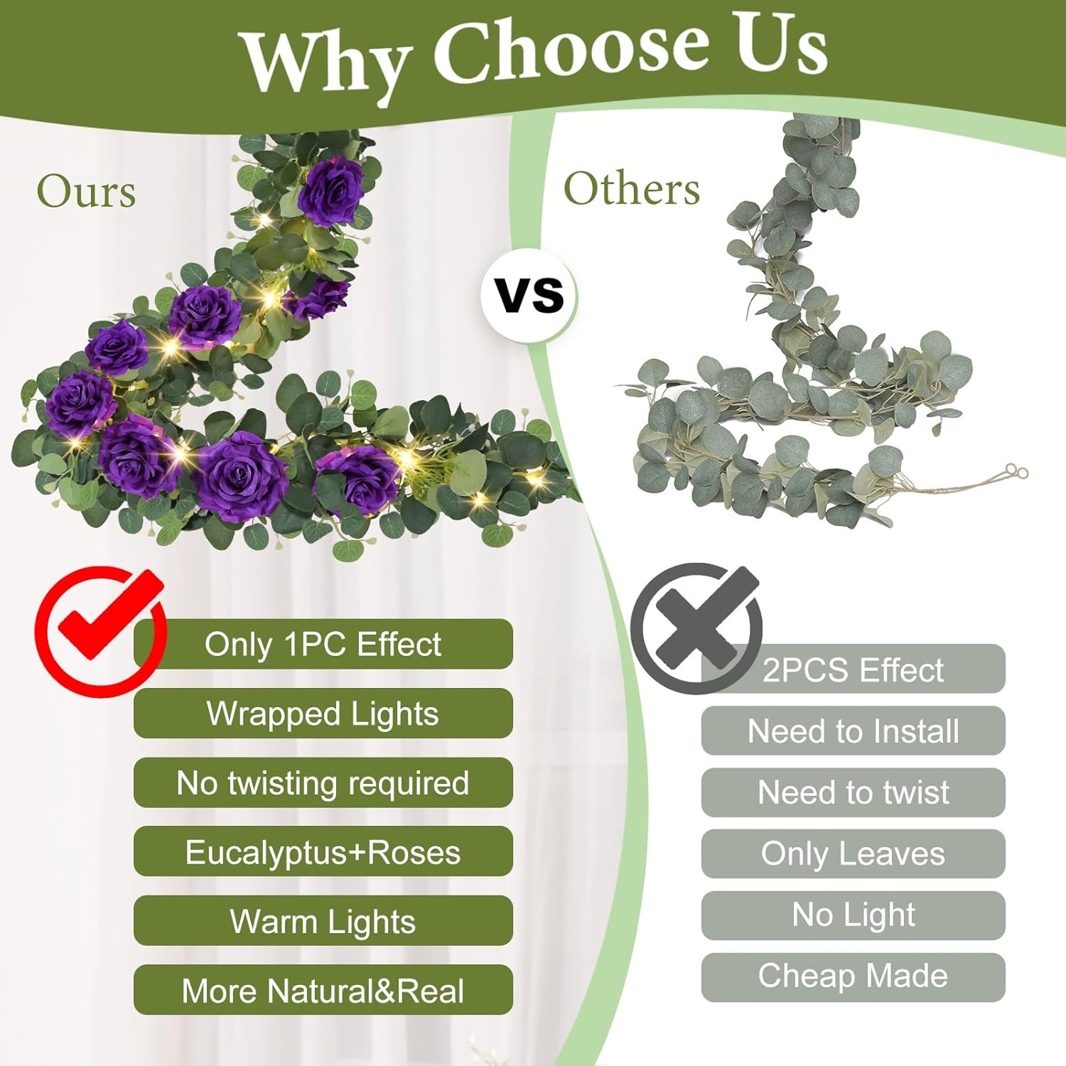 • Eucalyptus Garland with Built-in LED Lights: Transform any space into a magical setting with our 6.6FT eucalyptus garland, now upgraded with built-in led lights! Whether decorating a wedding arch, table centerpiece, fireplace mantel, backdrop, or outdoor garden fence, this rose flower garland brings timeless elegance and a touch of romance to any occasion. The versatile design allows for endless creative possibilities, making it perfect for weddings, Valentines Day, Mothers Day or seasonal celebrations