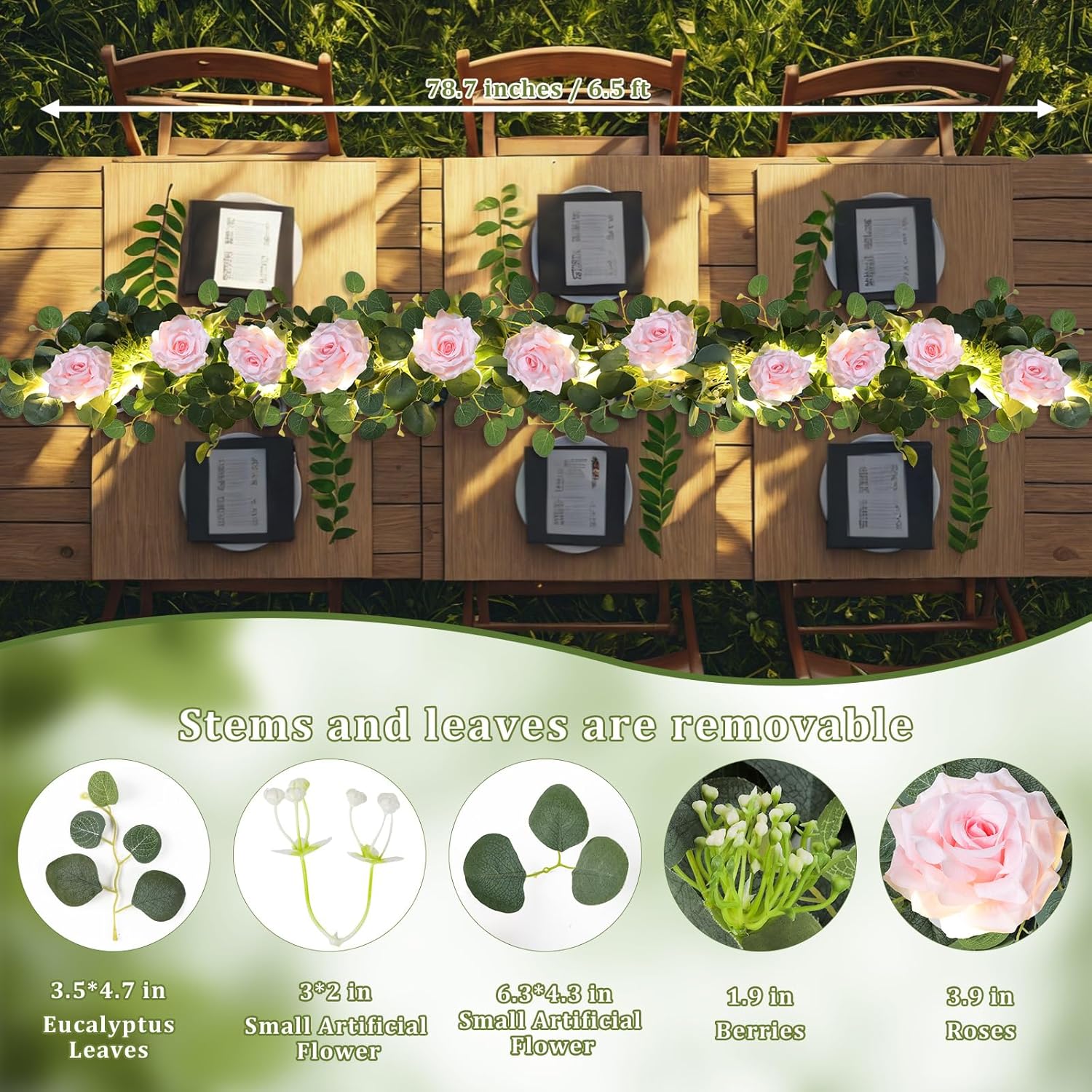 • Eucalyptus Garland with Built-in LED Lights: Transform any space into a magical setting with our 6.6FT eucalyptus garland, now upgraded with built-in led lights! Whether decorating a wedding arch, table centerpiece, fireplace mantel, backdrop, or outdoor garden fence, this rose flower garland brings timeless elegance and a touch of romance to any occasion. The versatile design allows for endless creative possibilities, making it perfect for weddings, Valentines Day, Mothers Day or seasonal celebrations