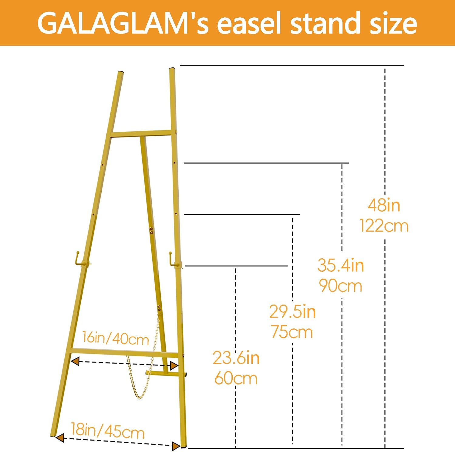 • LARGE EASEL STAND FOR DISPLAY โ€“ GALAGLAM's easel stand measures 19L x 18W x 48H inches and weighs 4.9 lbs