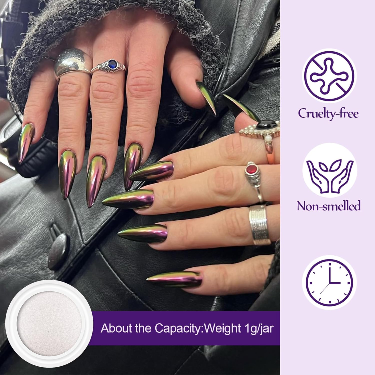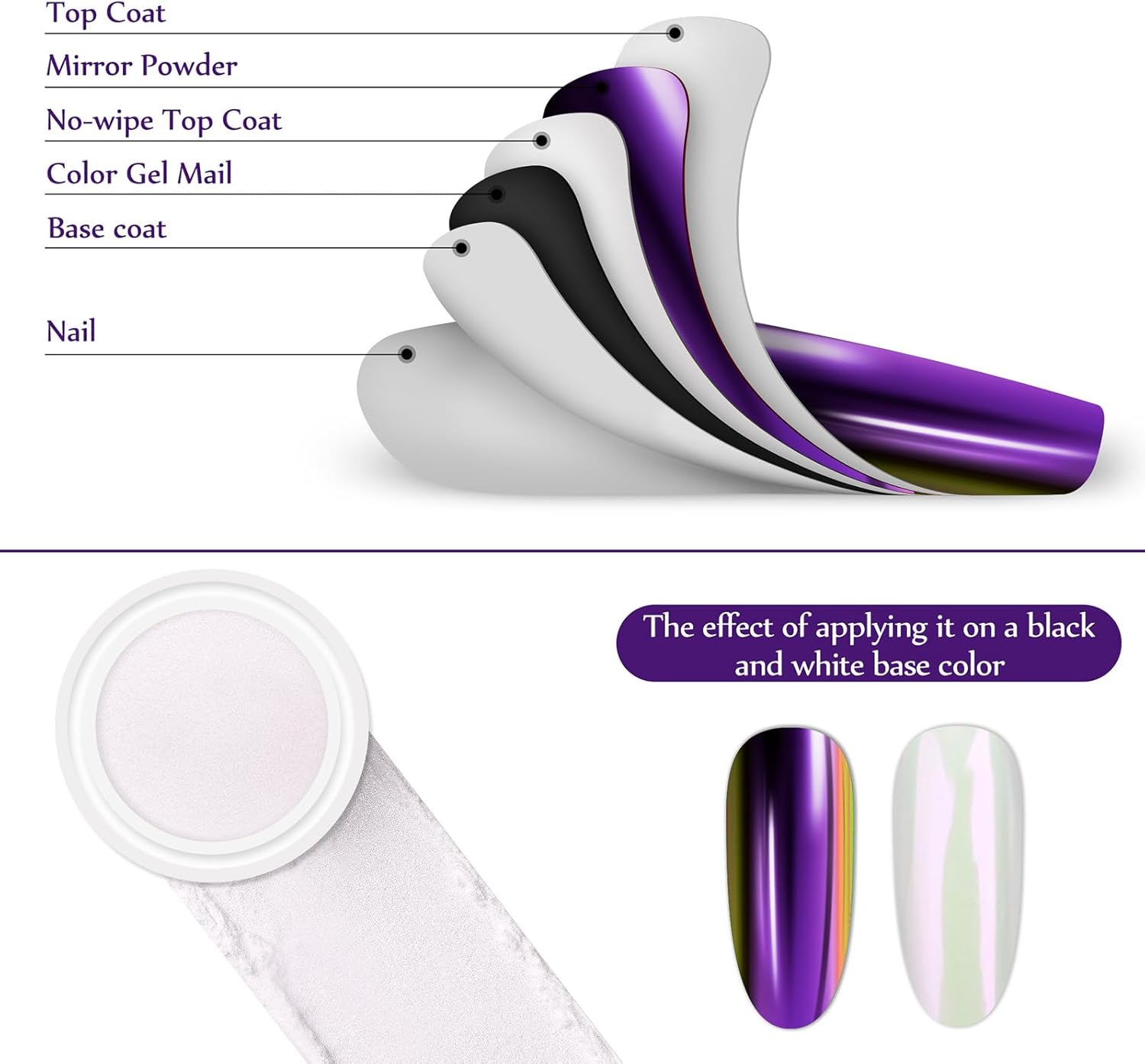 • 【PACKAGE CONTENTS】:16 pcs(each 1gram) Artdone Chrome Nail Powder, 2 for white based pearl nail pigment powders, 6 for Aurora chrome nail powder, 7 for mirror chrome powder, and 1 sliver holographic nail powder. They needs to be used with gel nail polish and no wipe top coat.