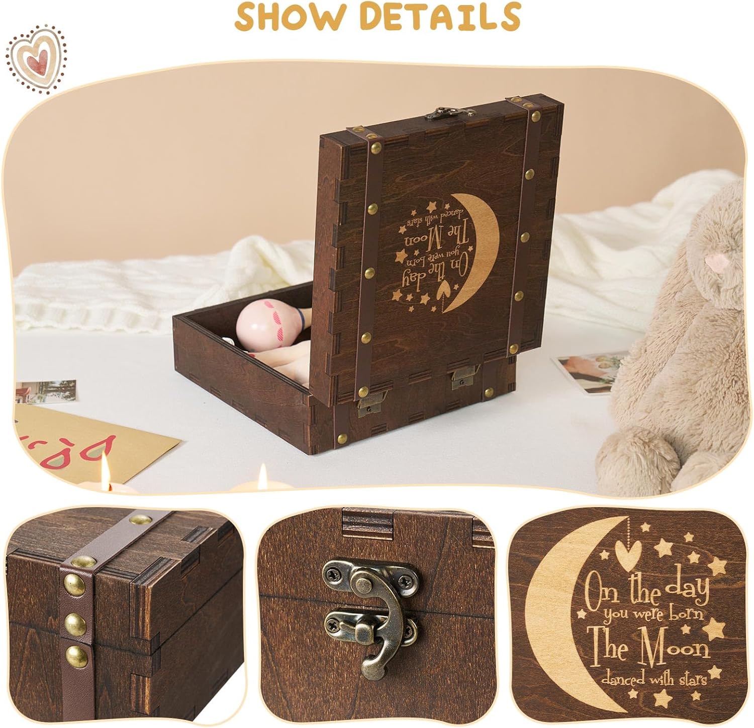 • 【Cute Design for Baby】Engraved text and cute moon on the outside lid, decorated with dark brown PU leather and rivet, vintage and novelty, a sturdy latch for security. Our beautifully engraved box is a sweet way to share your love to baby.