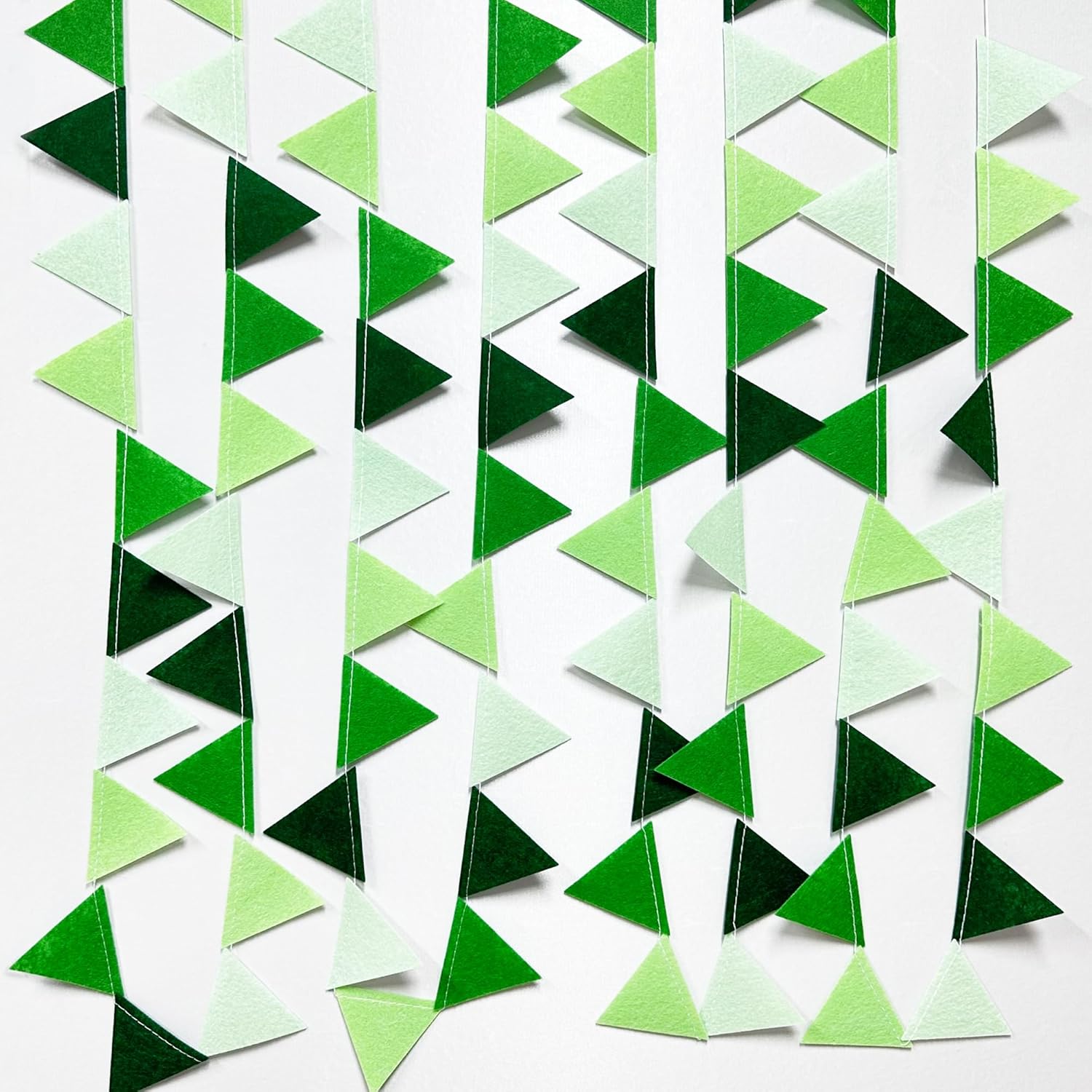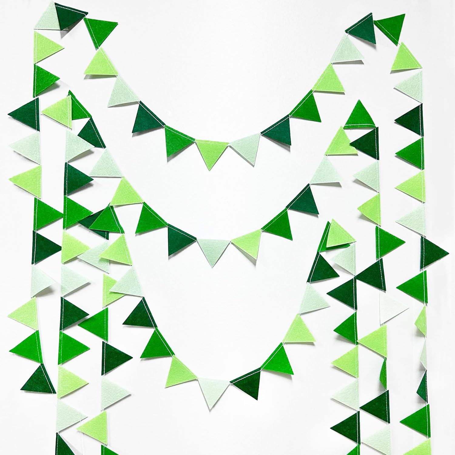 • ๐ŸŸขEasy Assembly - Easy hanging and reusable.Perfect fit for gradient green party decor.unroll and unwrap garland carefully. due to delicate nature of thread,may tangle.This green mini triangle pennant makes an attractive backdrop for videos and photos.