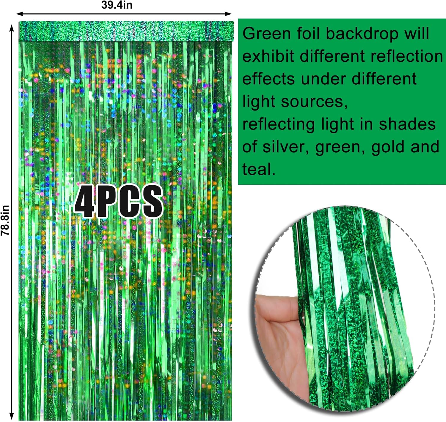 4 Packs Green Foil Fringe Curtain, Green Glitter Metallic Tinsel Backdrop for Birthday, Wedding, Baby Shower, Halloween, Christmas, Hawaiian Luau, Football, Dinosaur Jungle Party Decorations Supplies